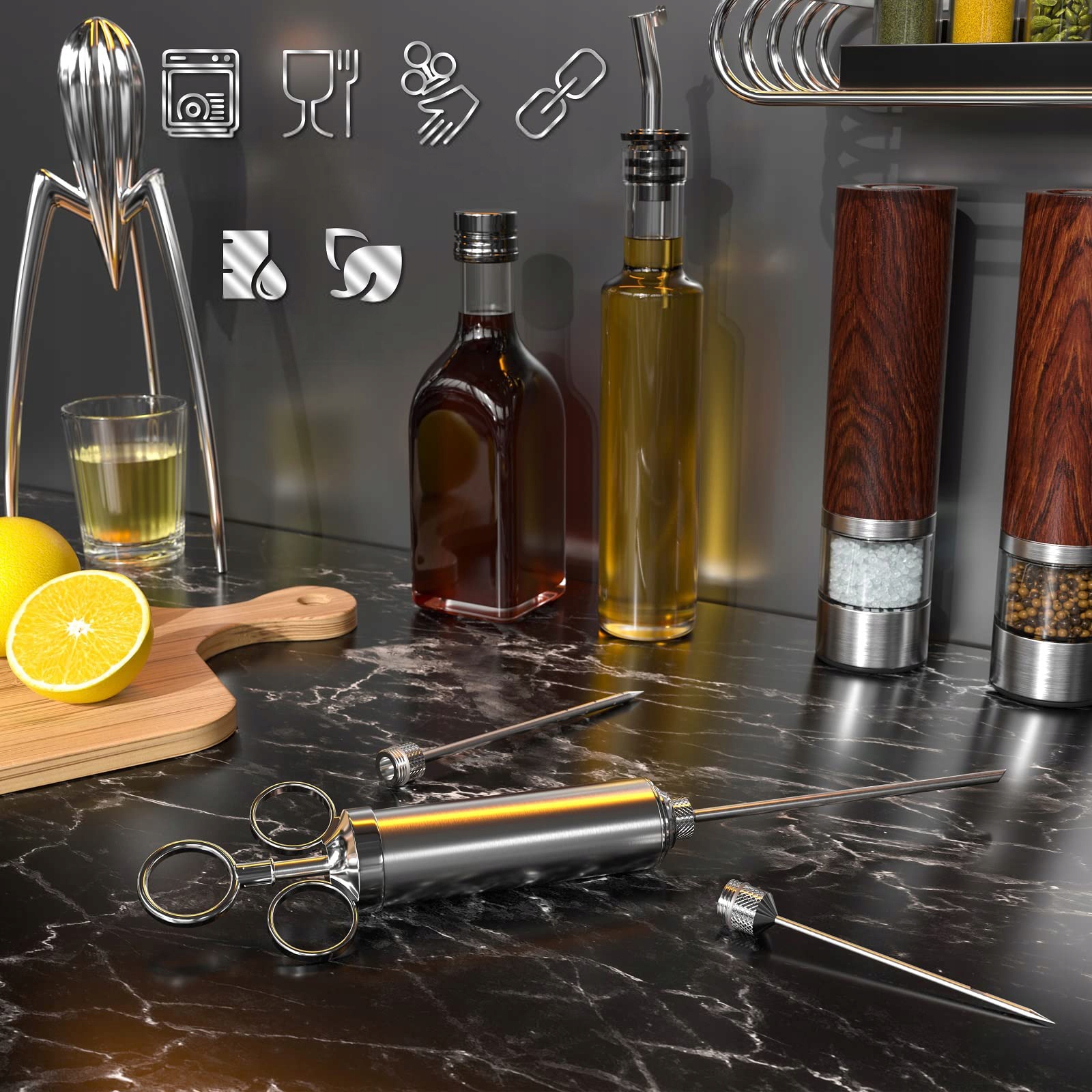 【3 типи голки та маринаюча пензлик】 Дві голки 14-14,5 см і один 11 см для різних застосувань. Голка з 12 отворами забезпечує навіть введення рідкого маринаду. Друга голка на 14 см з великим отвором на кінці підходить для більш товстих маринадів (наприклад, товстіші перцеві, розтоплені гриль -маринад, менші шматочки, такі як трави). Також є голка 11 см для введення рідкого маринаду в тонкі шматочки, такі як стейки та шашлики.
