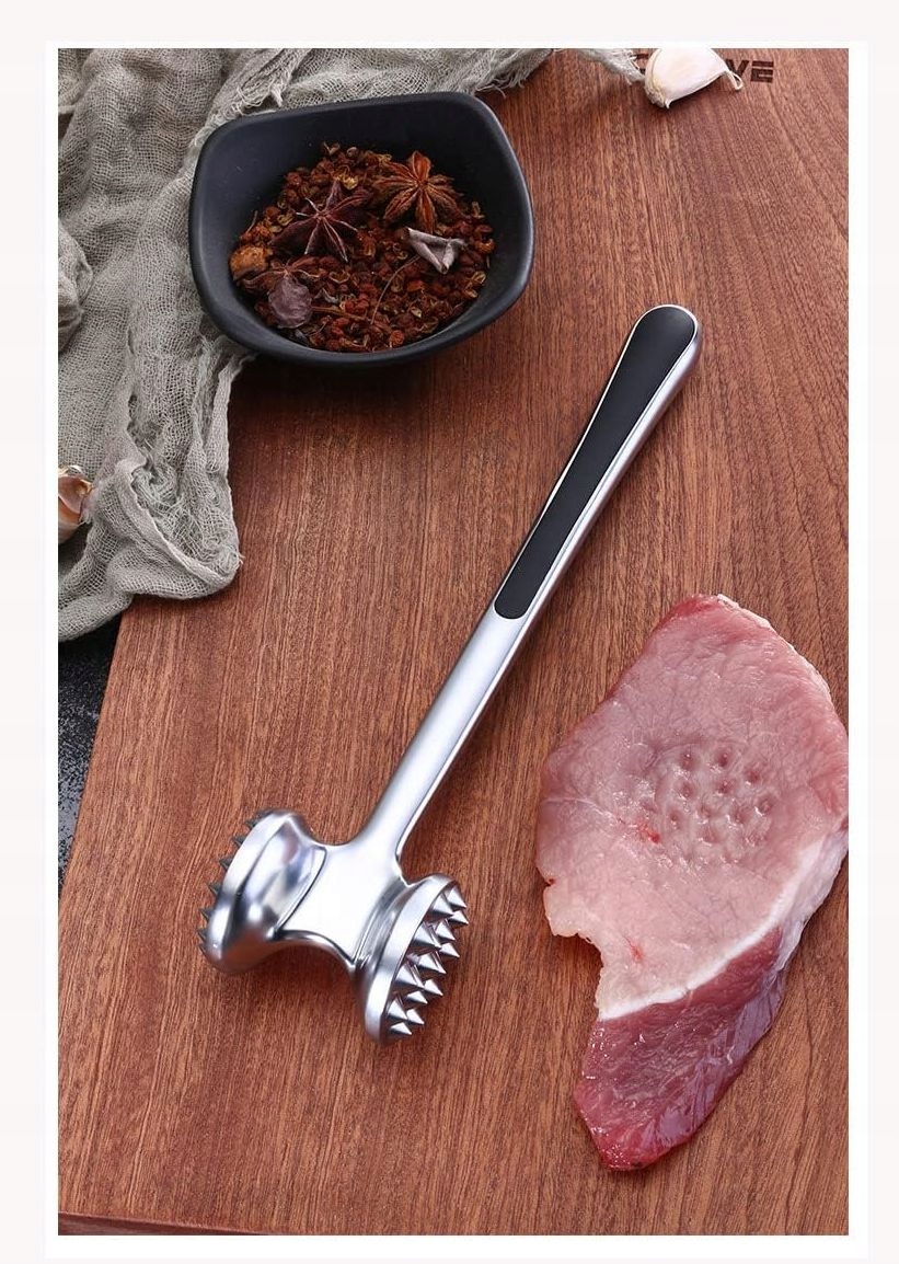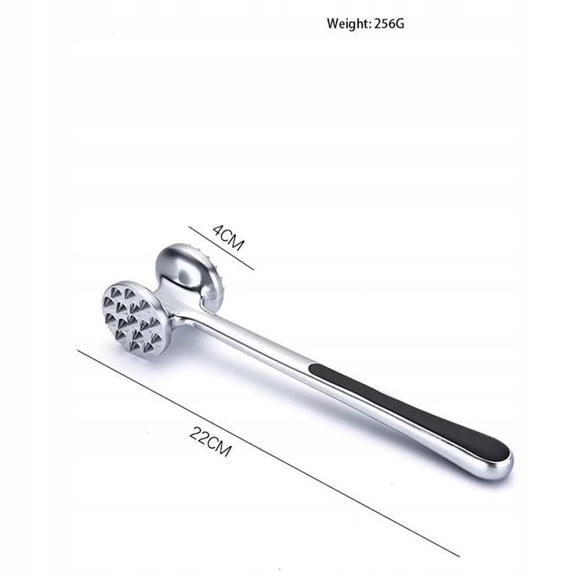 - Прилад для розм’якшення м’яса з подвійною ударною поверхнею довжиною 22 см для м’яса, який легко тримати в руці та вимагає невеликих зусиль під час обробки шматків м’яса
