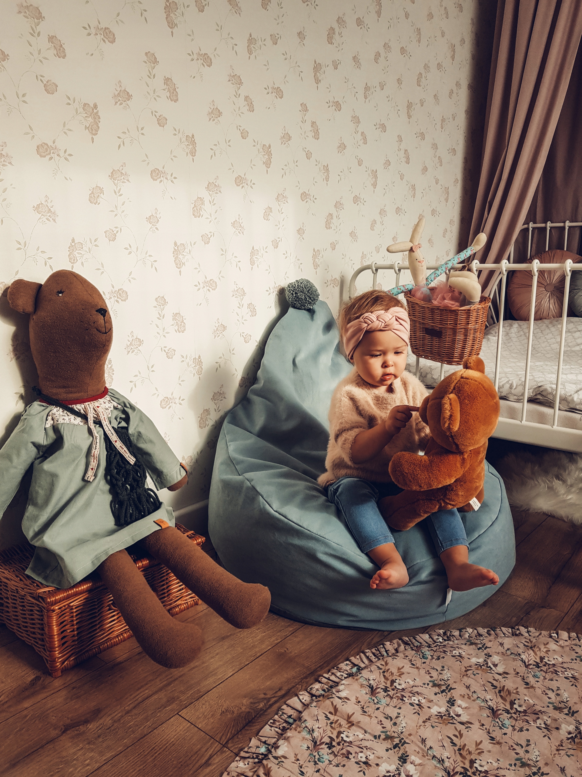 Пуф/сумка має знімний чохол для прання. Всередині є додаткова кришка з першокласною кулькою з пінопласту з замком.