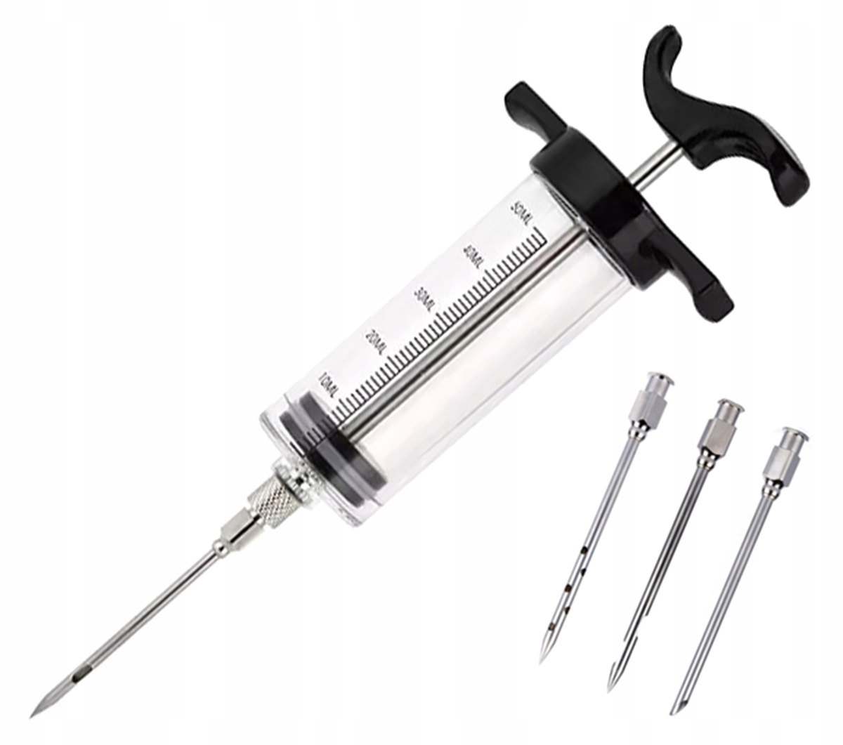 - Дуже простий у використанні. Просто наповніть шприц спеціями/маринадом і введіть вміст у м'ясо за допомогою однієї з голки.