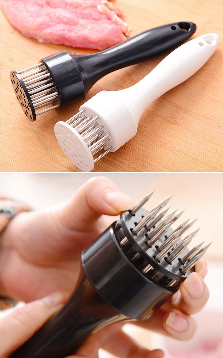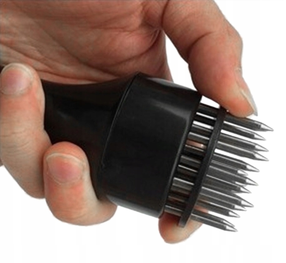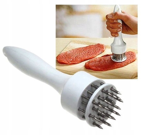 Виріб, який стане в нагоді на кожній кухні, ідеально підходить для приготування м'яса перед смаженням або грилем. Голова оснащена 21 шпилькою, якою проколюють м'ясо під час подрібнення. Леза створюють тонкі канали в м'ясі, що скорочує час приготування на 40% і дозволяє маринаду краще вбиратися. Пірсинг також зменшує усадку м'яса під час смаження або гриля, дозволяючи більше природного соку залишатися в м'ясі. Зручна ручка виконана з пластику. Підставка встановлена на пружині, що гарантує захист від травм при зломі. Він також має отвір у ручці, завдяки якому ми можемо повісити продукт у місці, де він завжди буде під рукою.