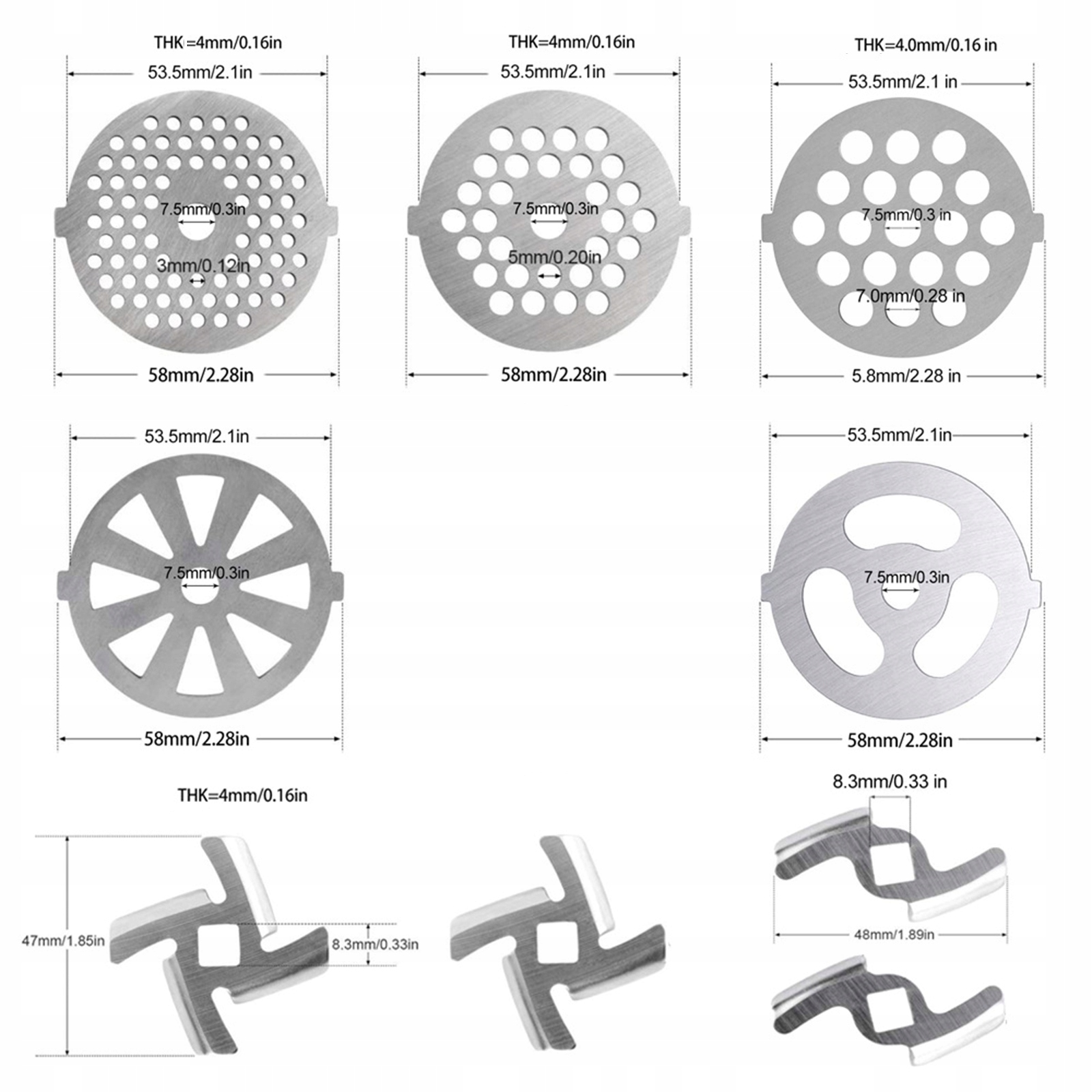 【Стійкий матеріал】 Леза та диски м’ясорубки виготовлені з високоякісного залізного матеріалу з високою твердістю, який має хорошу стійкість до подряпин і зносу, його нелегко зламати, міцний і довговічний