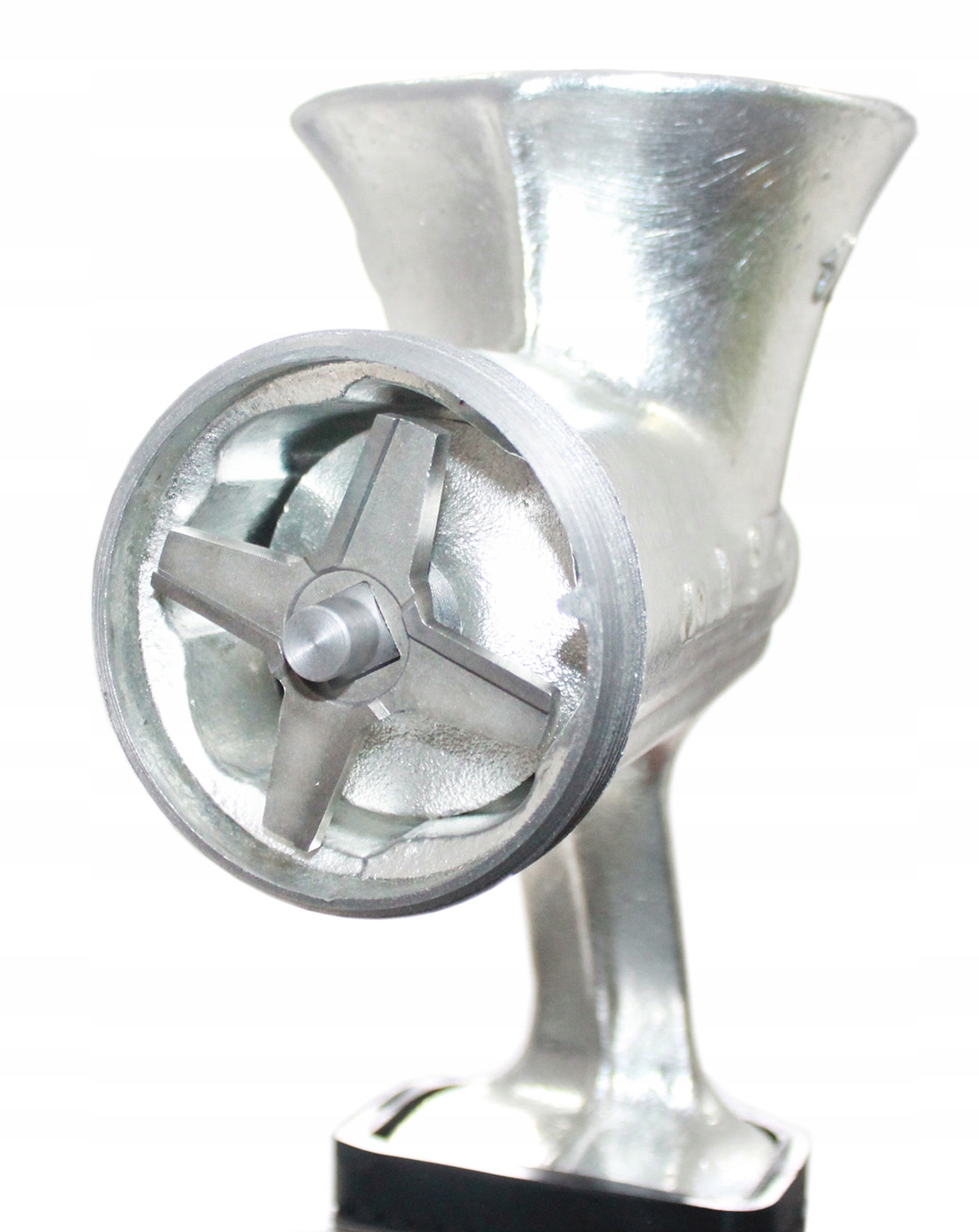 Тверда м'ясорубка "ALFA" від польського виробника. Найважливішою частиною м'ясорубки є ідеально підігнане гвинтове колесо, яке при повільному обертанні (приводиться вручну рукояткою) переміщує шматки м'яса до ножів, що обертаються разом із гвинтовим колесом, подрібнюючи м'ясо, продавлене через диск із невеликими отворами з гострими краями.