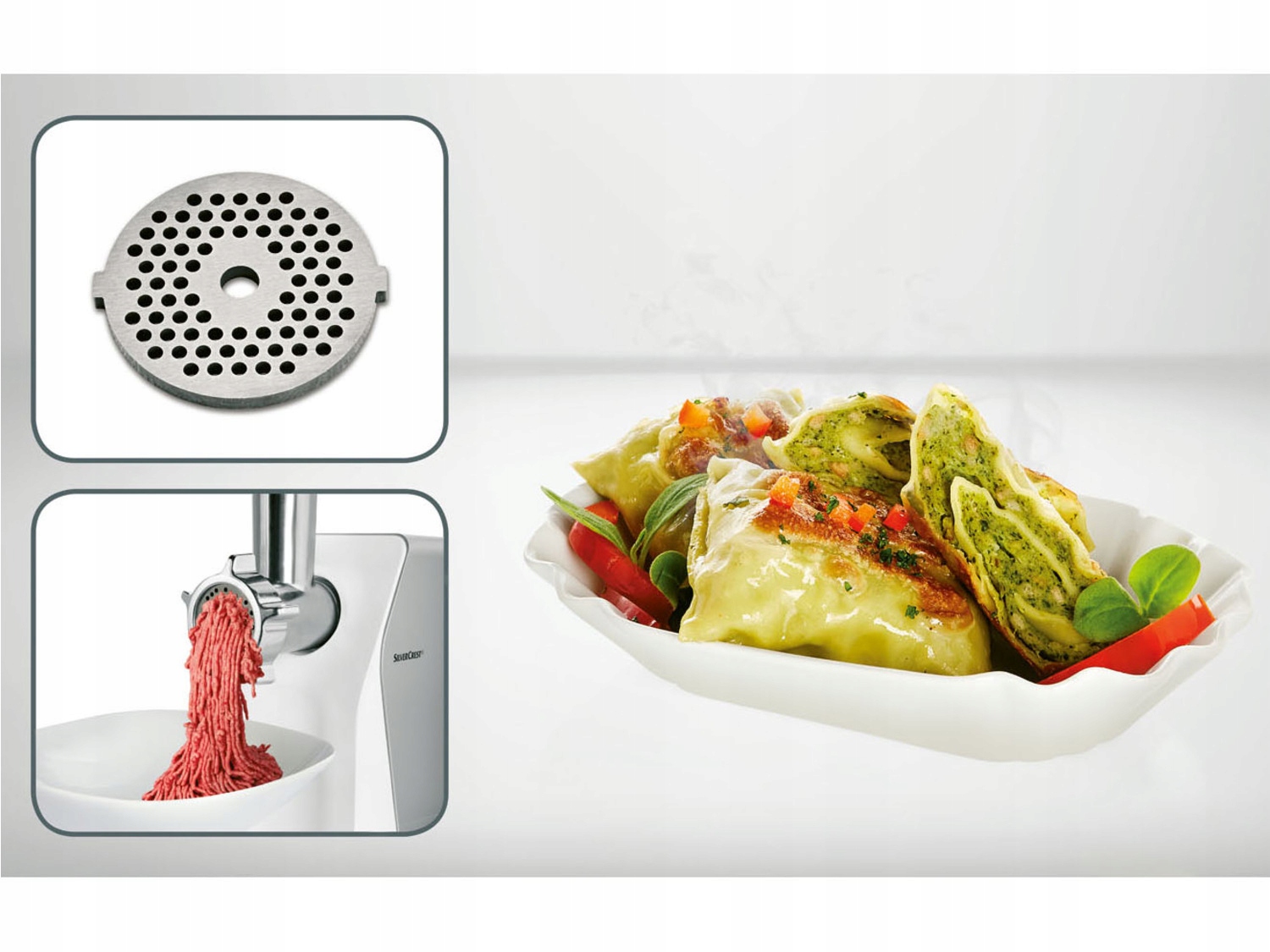 У набір входить: розливний піддон з штовхачем, 3 ситечка з отворами (велике 7 мм, середнє 5 мм, маленьке 3 мм), насадка для начинки ковбаси, насадка для кеббе, насадка для печива