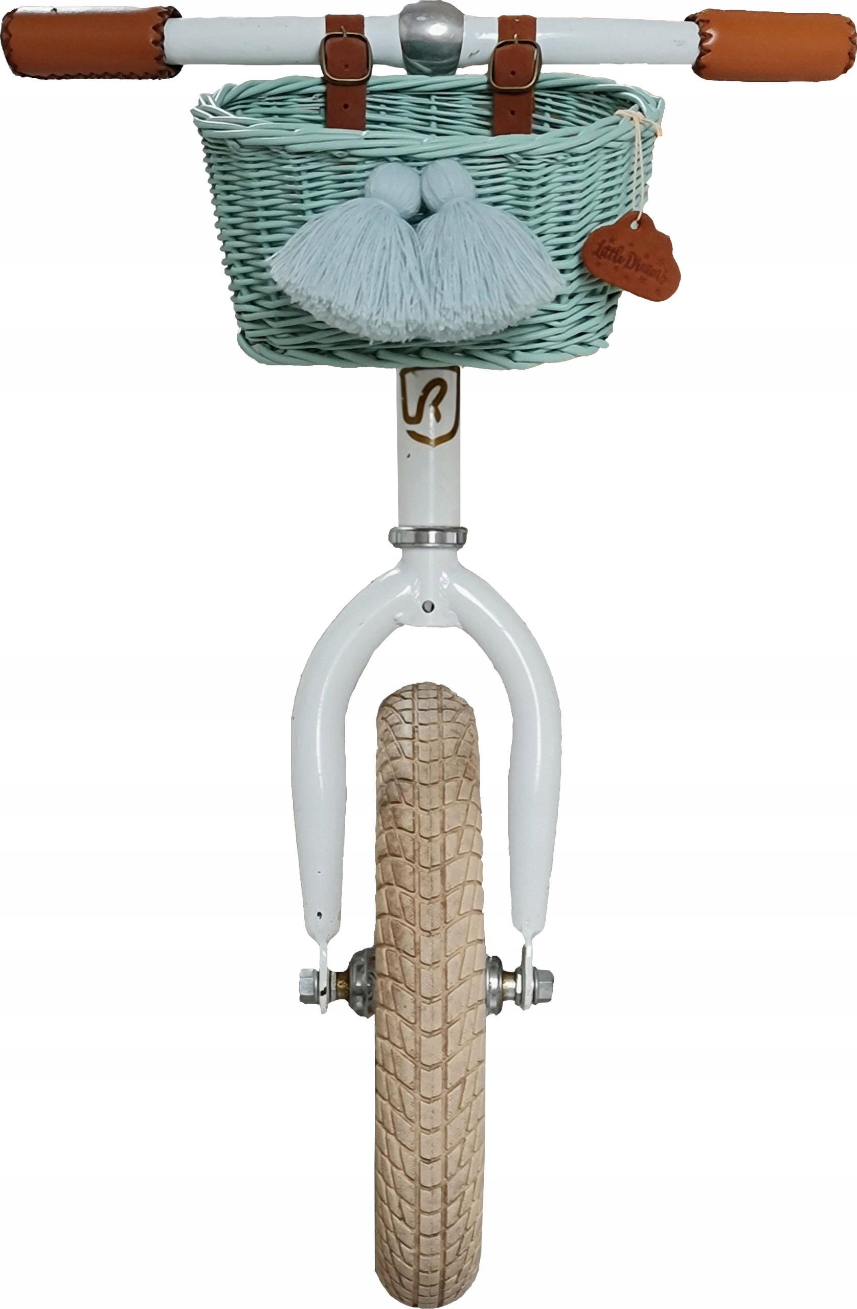 Красивий плетений велосипедний кошик із застібками з натуральної шкіри. Для найнеобхідніших скарбів маленького мандрівника.