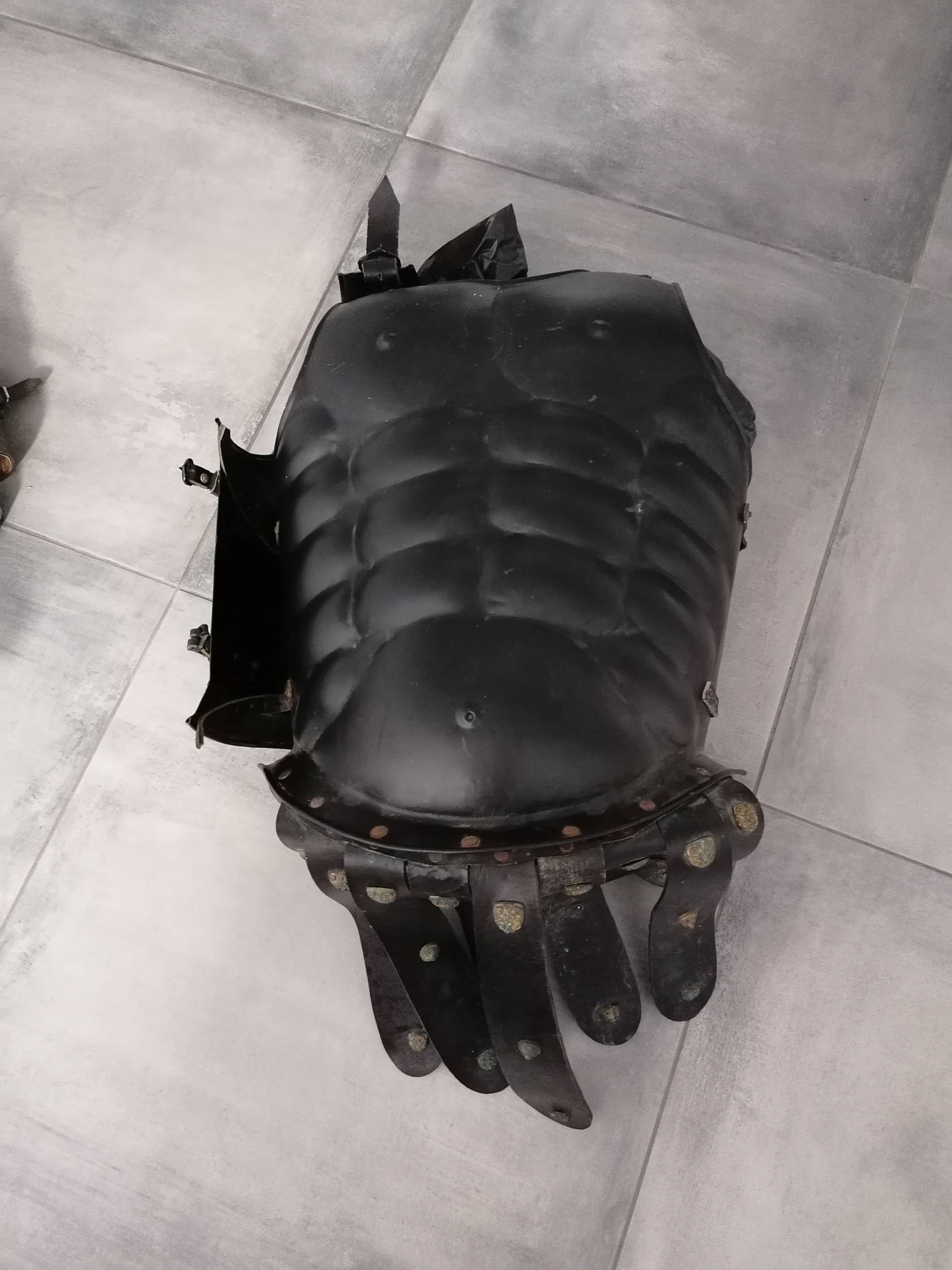 зі сталі, застібається шкіряними ременями з боків і на плечах