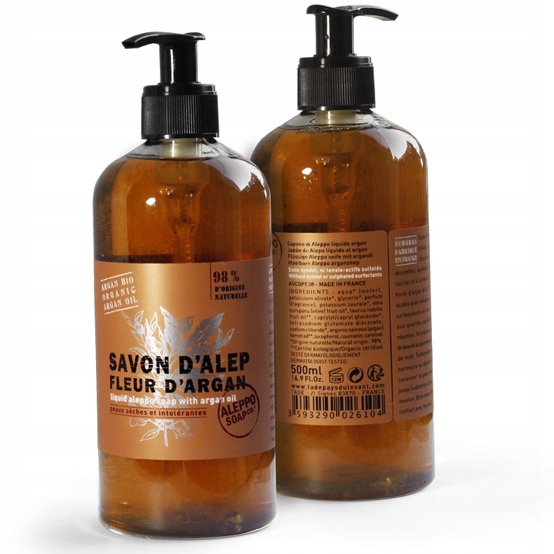 Високоякісне натуральне оливково-лаврове рідке мило з додаванням органічної арганової олії, вироблене в чанах традиційним способом ремісничі методи. Делікатний аромат з ніжною нотою квітки арганії. Оливкова олія та лаврова олія, отримані з ретельно відібраних культур. Омилена поташем. Спільна робота майстрів миловаріння Алеппо та Провансу.