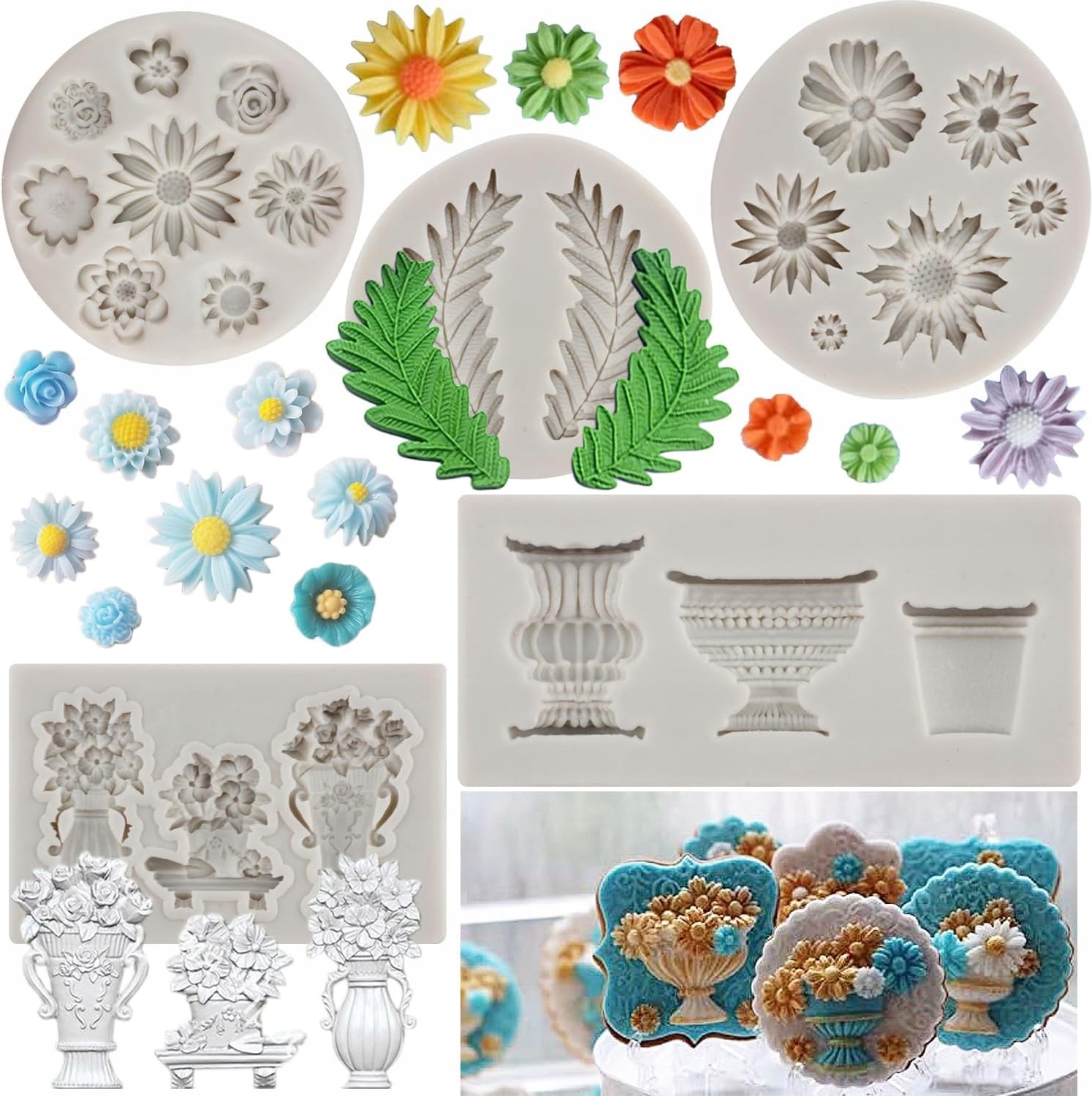 Ви отримаєте 1 силіконову ромашку, 1 силіконову форму хризантему, 1 цвіль силіконової вази, 1 цвіль силіконової папороті та 1 силіконову форму у формі горщиків. Розмір кожної форми різний