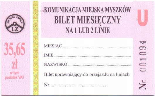 Тема аукціону - це періодичний квиток громадського транспорту - Myszków. Не використовується, значення колектора. Дуже хороший стан. Аверс і зворотно на скануванні.