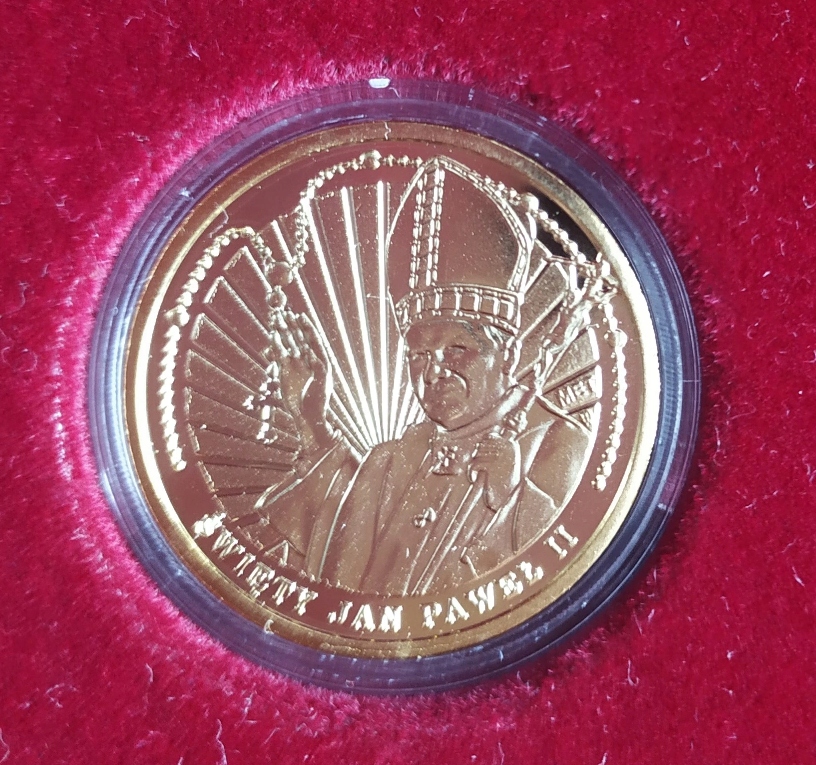 Реверс: У центрі, у неповному обідку, утвореному намистинами вервиць, зображено святого Івана Павла ІІ із круговими променями, що розходяться. у фоновому режимі; у нижній частині жетона напис півколом: СВЯТИЙ ІВАН ПАВЛО ІІ.