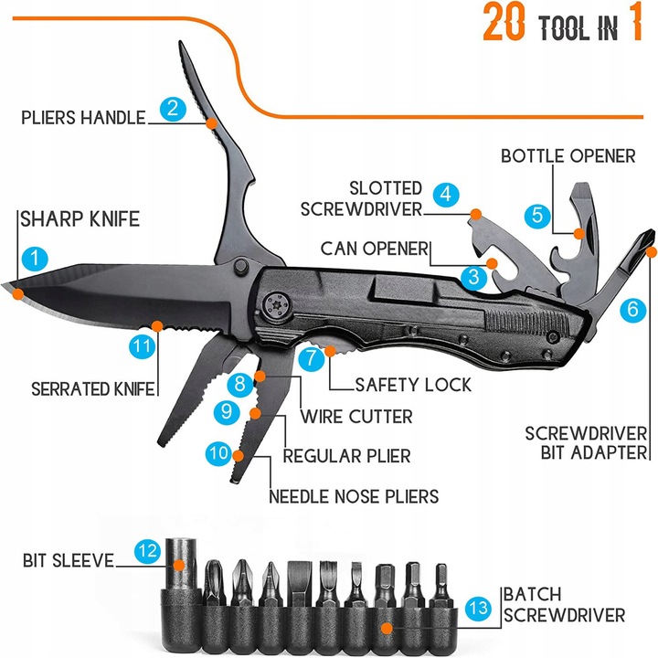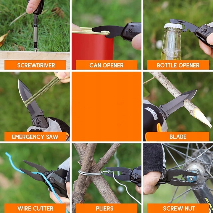 Цей високоякісний багатофункціональний ніж є справжнім скарбом для кожного ентузіаста DIY, кемпінгу чи риболовлі. Він має понад 20 функціональних можливостей, зокрема гостре лезо, відкривачку для банок і пляшок, набір насадок для викруток і багато інших корисних інструментів, завдяки яким будь-яке завдання більше не буде проблемою.