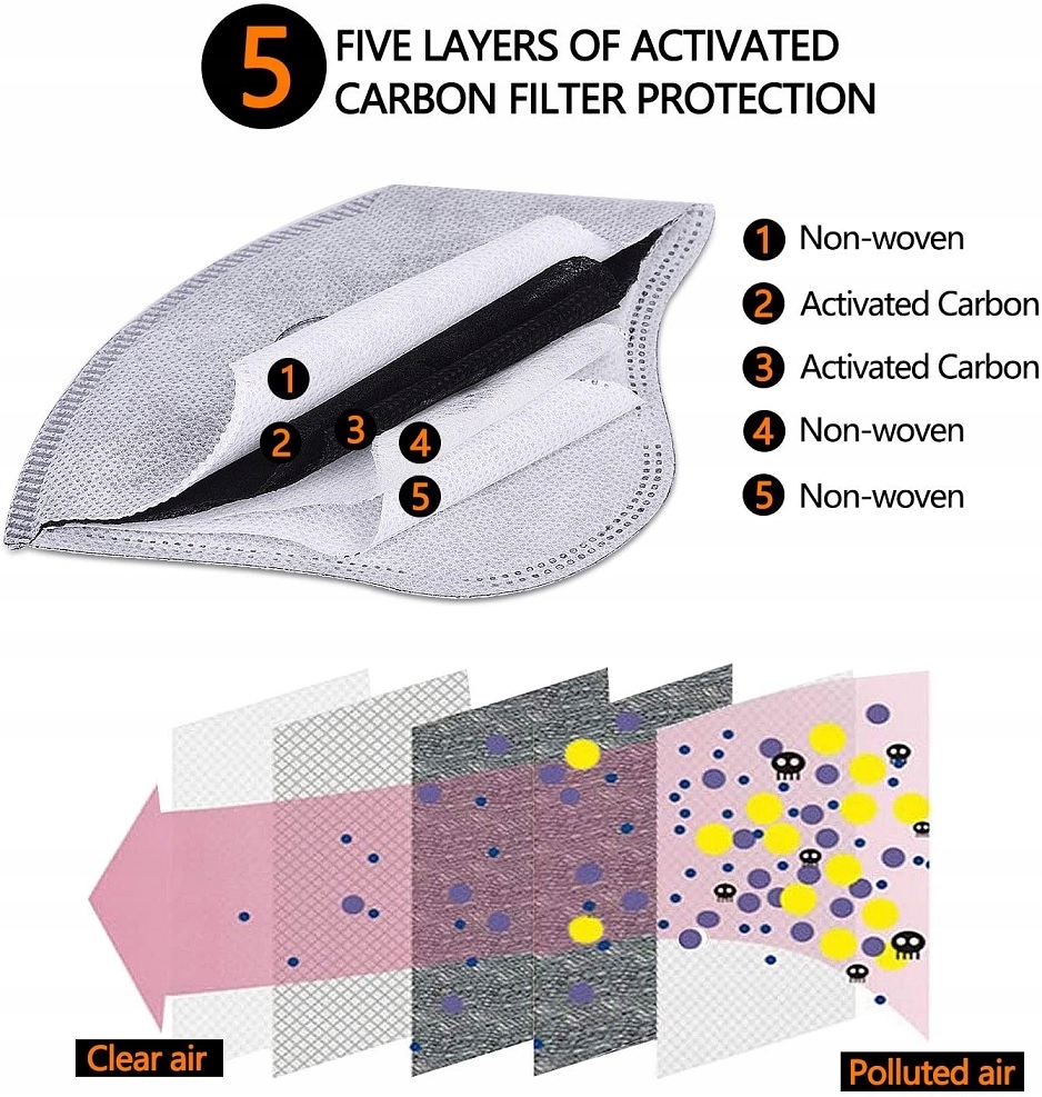 Змінні фільтри забезпечують додатковий рівень захисту. Це N95/KN95/FFP2HEPA фільтри з активованим вугіллям з високою ефективністю фільтрації. Вони затримують шкідливі забруднювачі, бактерії, частинки носіїв вірусів, пил PM 10 і PM 2.5 і багато інших мікроорганізмів, алергени, вихлопні гази, пилок, пил, тютюновий дим і т.д. Загалом вони ефективно фільтрують понад 130 токсичних речовин. Фільтри якісні - п'ятишарові. Одного фільтра вистачає приблизно на 30 годин безперервного носіння. Цей фільтр має 5 шарів, включаючи протипиловий, протипиловий та активоване вугілля. Фільтрація 95-98%. Фільтри можна швидко й легко замінити, відкрутивши клапани, які їх утримують.