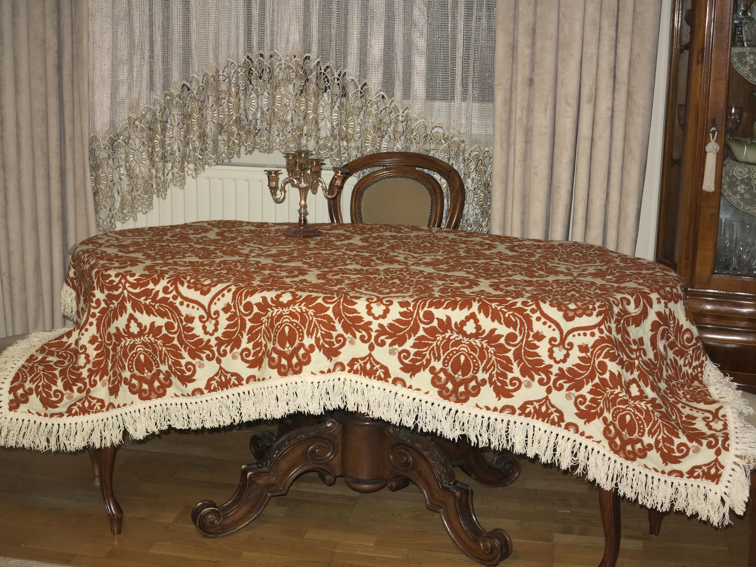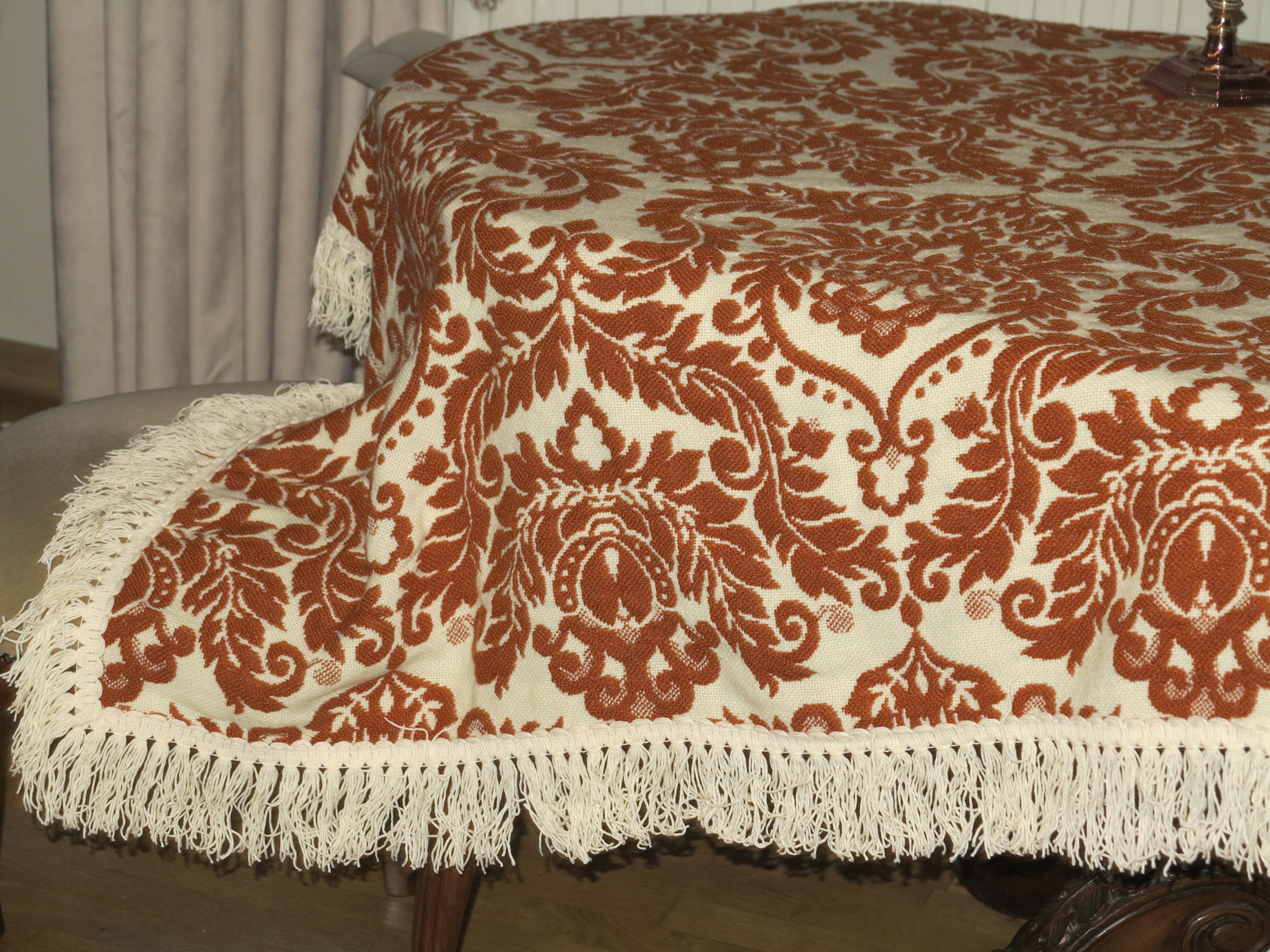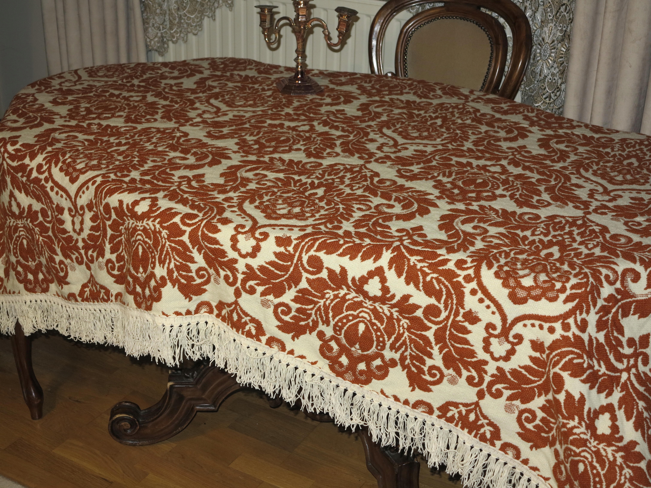 ПІД АНТИКВАРІАТ - КРАСИВУ СТАРОВИННУ СКАТЕРТИНУ АБО КОПИ ЗІ СТИЛЬНИМИ ВЗІЗУРКАМИ. ВСЕ НАВРУХ ОБРОБЛЕНО ХАЗАРДИСОМ З ГУСТИМИ БАХОМКАМИ. КОЛЬОРИ: ЕКРЮ ТА ЦЕГЛА