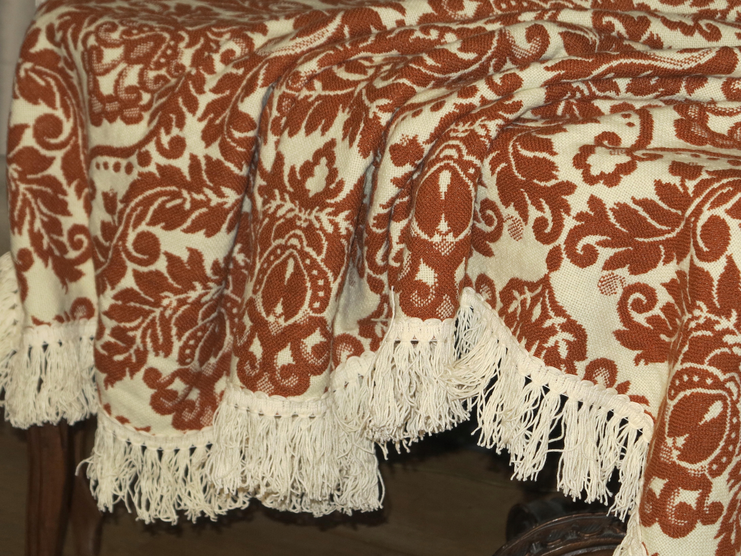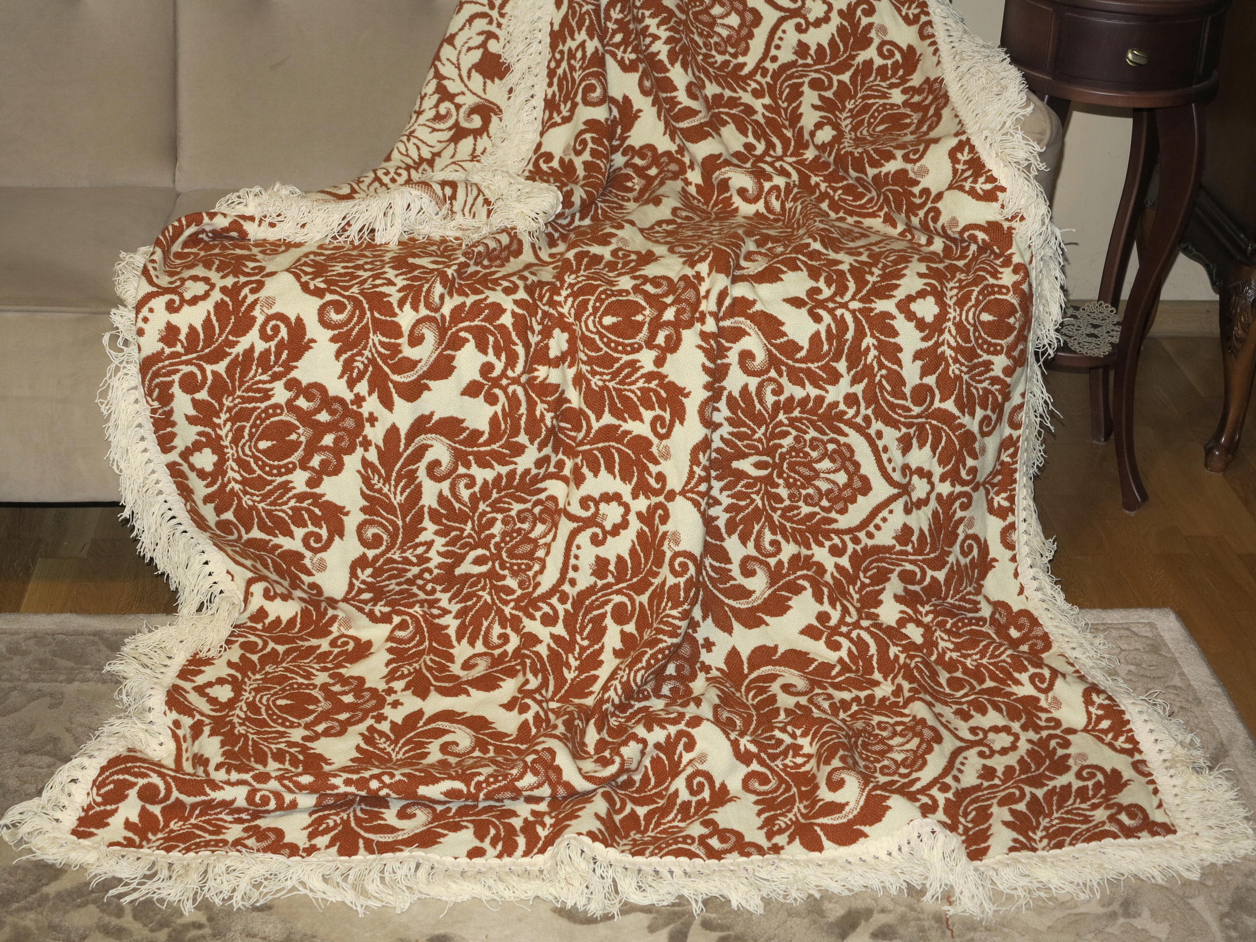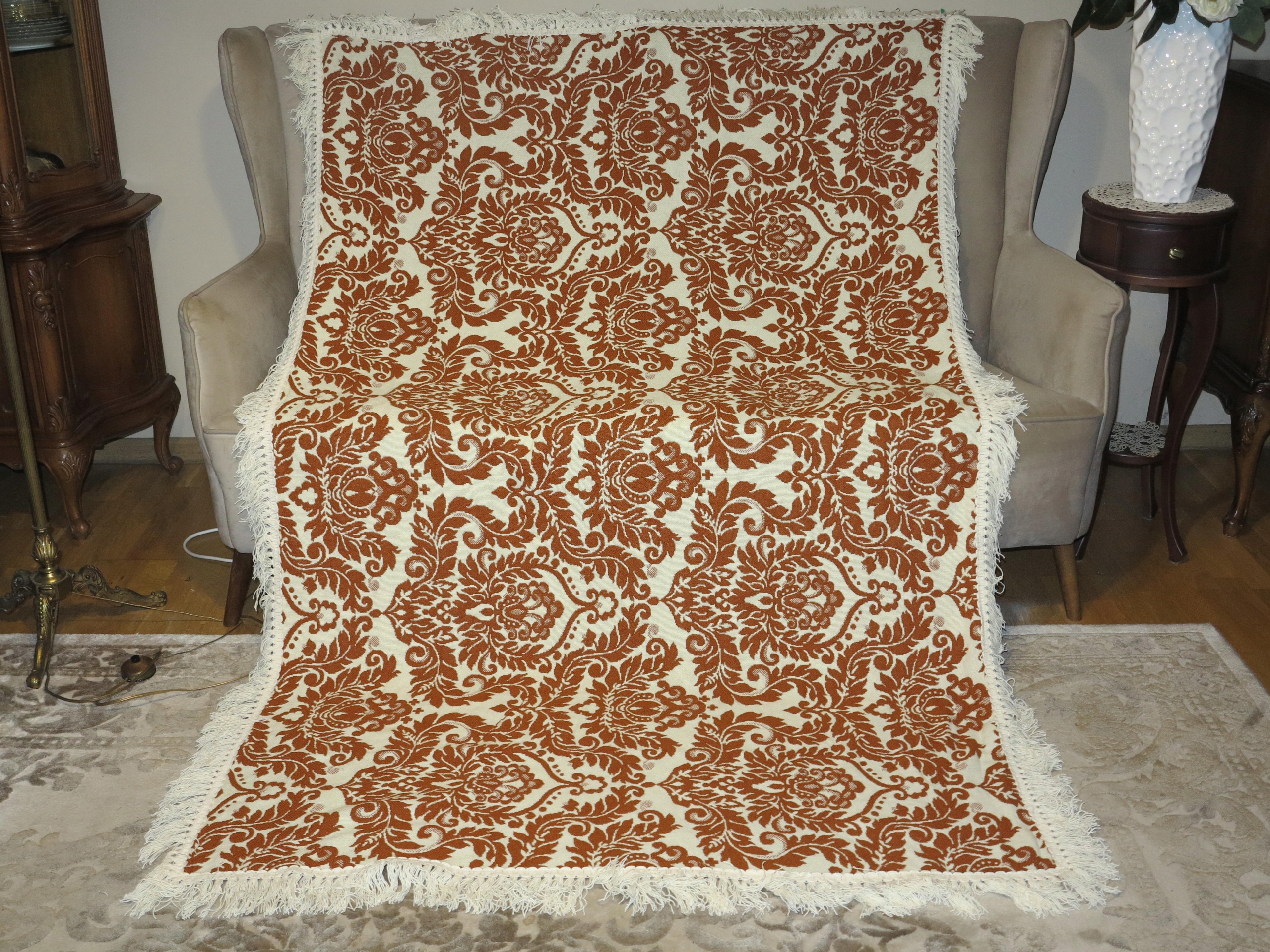 ПІД АНТИКВАРІАТ - КРАСИВУ СТАРОВИННУ СКАТЕРТИНУ АБО КОПИ ЗІ СТИЛЬНИМИ ВЗІЗУРКАМИ. ВСЕ НАВРУХ ОБРОБЛЕНО ХАЗАРДИСОМ З ГУСТИМИ БАХОМКАМИ. КОЛЬОРИ: ЕКРЮ ТА ЦЕГЛА