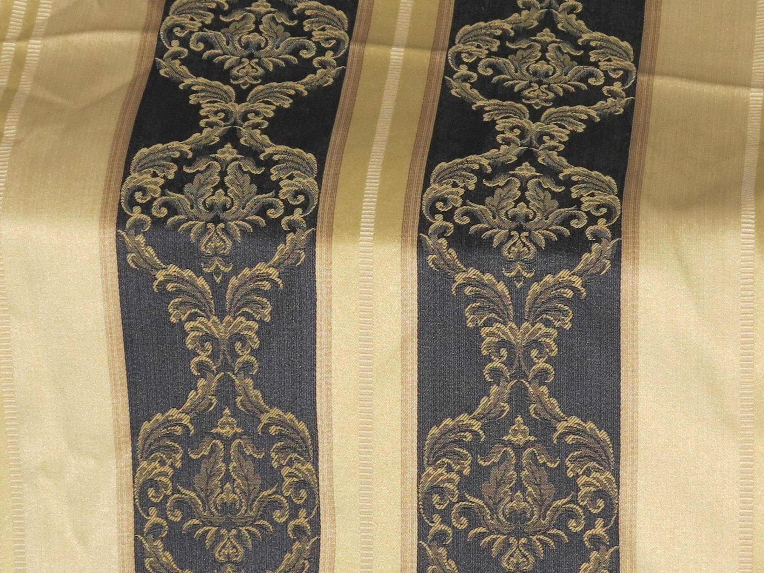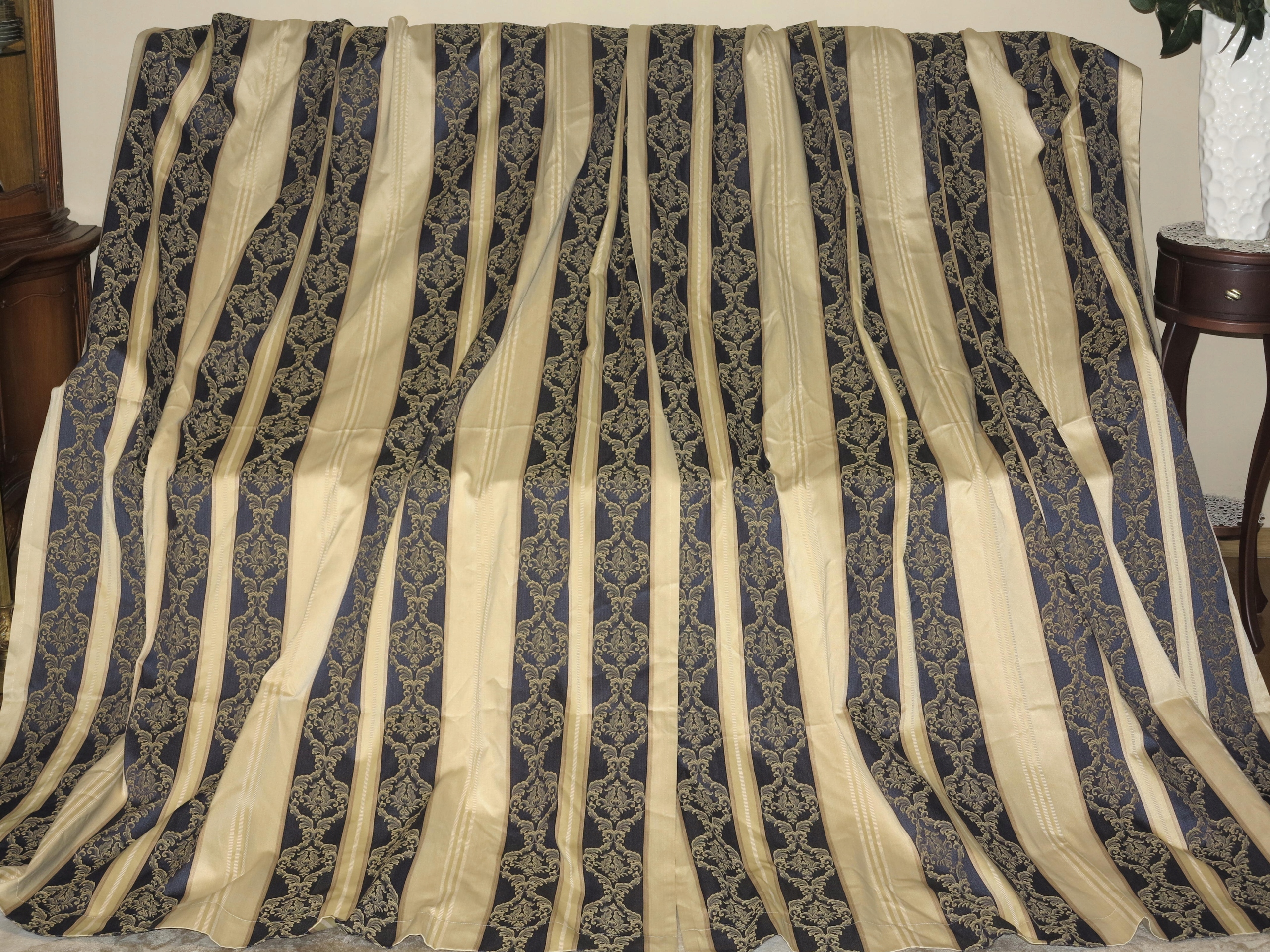 ДЛЯ АНТИКВАРІАТУ - М'ЯКУ СТИЛЬНУ ШТОРУ З ЛЮДВІКОВОМИ СМУЖКАМИ ТА ВИЗІРУНКОМ. СМУЖКИ ТЕМНО-СИНІЙ ТА СВІТЛО-ЗОЛОТИЙ. НА ТКАНИНІ ДОДАТКОВО НАШИБОВАН ЗОЛОТИЙ ВИЗІРУНОК.