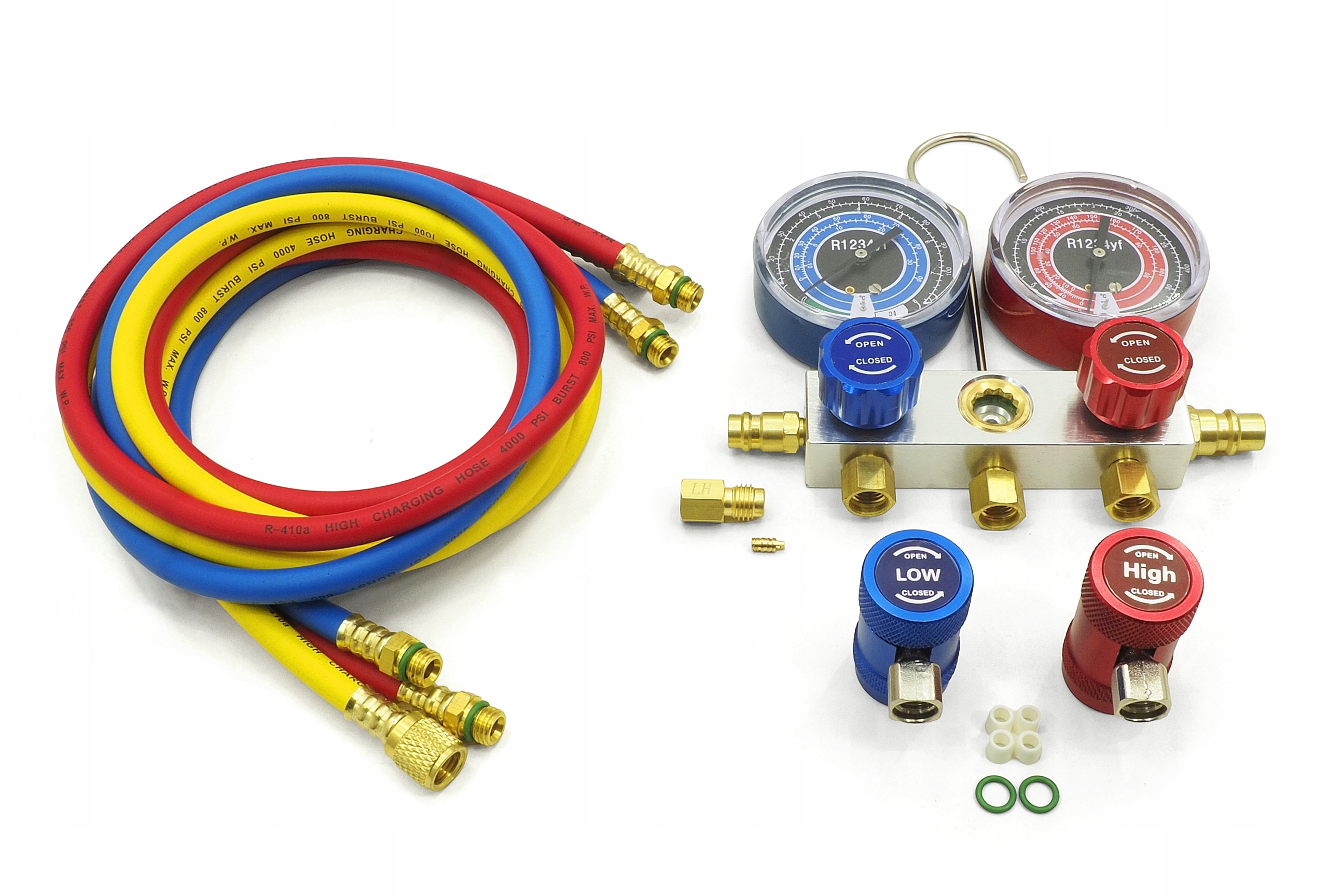 Набір манометрів для кондиціонування автомобіля та стаціонарного кондиціонера на факторі r1234yf разом з трьома барвистими зміями з довжиною близько 140 см та швидкими муфтами для кондиціонування автомобіля. Побічний тиск високого тиску та бічний тиск низького тиску зі специфікацією системи кондиціонування. Тестер кондиціонування, завдяки жовтому сервісному кабелю, також буде використовуватися під час спорожнення та заповнення систем кондиціонування.
