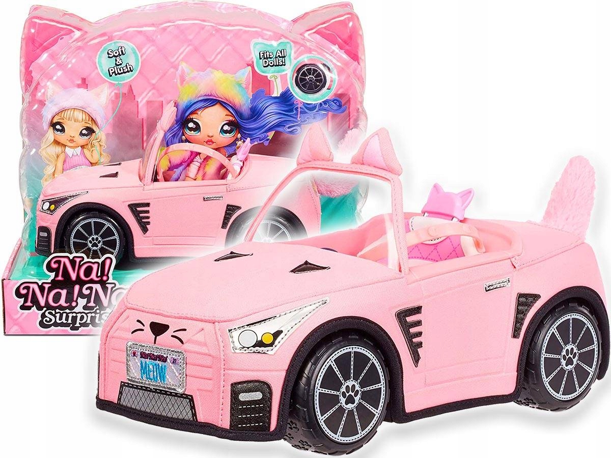Відтепер, Na dolls! на! на! Сюрприз може подорожувати в першому в історії автомобілі! Ця стильна рожева лялькова машина виготовлена з м'якого плюшевого матеріалу з швами та принтами. Має чарівні котячі деталі, зокрема котячий ніс і вуса, вушка на лобовому склі та м’який пухнастий хвіст. Він також має блискучі сріблясті деталі, номерний знак MEOW і сучасні чорні деталі. І всі деталі справжнього автомобіля. Колеса, які дійсно котяться, і кермо. Транспортний засіб підходить для всіх ляльок Na! на! на! Сюрприз та інші ляльки подібного розміру. Ляльки продаються окремо.