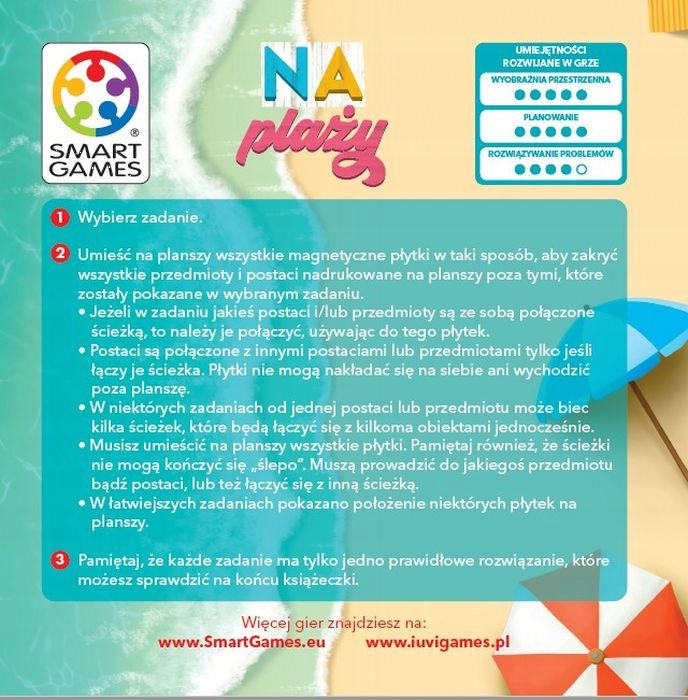На піщаному пляжі не бракує захоплюючих завдань! Ласкаво просимо в гру «На пляжі»! Ця гра-головоломка з магнітними елементами поставить перед вами та вашою дитиною захоплюючі завдання! Місія полягає в тому, щоб допомогти гостям пляжу знайти свої іграшки, уникаючи випадкових поїздок і зіткнень! Завдяки вашим навичкам аналізу та дедукції ви зможете виконати 48 різних завдань зростаючої складності. Дружня тема та барвистий дизайн заохочують до подальшої гри, водночас дозволяючи природний розвиток ключових логічних навичок. Завдяки магнітним елементам гру можна легко взяти куди завгодно, навіть у подорож! Навчання через гру є ключовим елементом серії Smart Games! Дослідіть це сьогодні, і нехай ваша дитина зрозуміє, чому їй сподобається ця гра! Переваги цієї гри, які сподобаються вашій дитині: - Дружня літня тема - Виразний дизайн - Ідеально підходить для подорожей Додані переваги цієї гри: Тема, яка дозволяє втекти від реальності, пожвавить навіть найтепліші будні, подарувавши радість і позитивні емоції під час гри. Міцна конструкція невеликого розміру дозволить вам брати цю гру з собою всюди, що забезпечує гнучкість і можливість використовувати її де завгодно. Ідеальна альтернатива вашому телефону - ця гра є унікальним способом провести час під час подорожей, незалежно від того, перебуваєте ви в машині, літаку чи поїзді. Це дозволить уникнути надмірного використання електронних пристроїв, одночасно стимулюючи творче мислення. У набір входить: - Магнітна дошка з 48 завданнями та їх розв’язаннями - 5 магнітних плиток Виробник: Smart Games Виріб підходить для дітей старше 6 років ```
