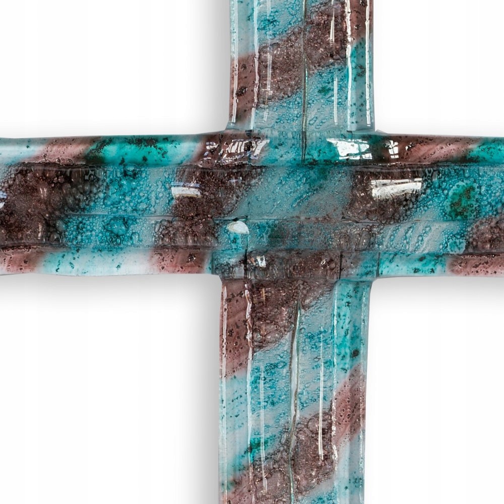 Бірюзовий-коричневий скляний хрест на стіні виготовлений з фарбованого скла, що виробляє ефект бульбашок, тобто везикули різних відтінків та різних розмірів та форм. Синій колір має широкий діапазон відтінків і блиску, завдяки прозорим шарам скла.