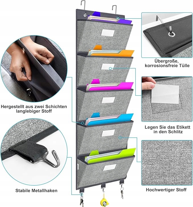 - Сила та хороша майстерність : настінна вішалка для документів виготовлена з двох шарів міцного матеріалу та картону з товщиною 2 мм. Два нержавіючі очі вгорі полегшують повіслення. 4 Його можна використовувати для зберігання документів, діаграм, журналів, папки тощо