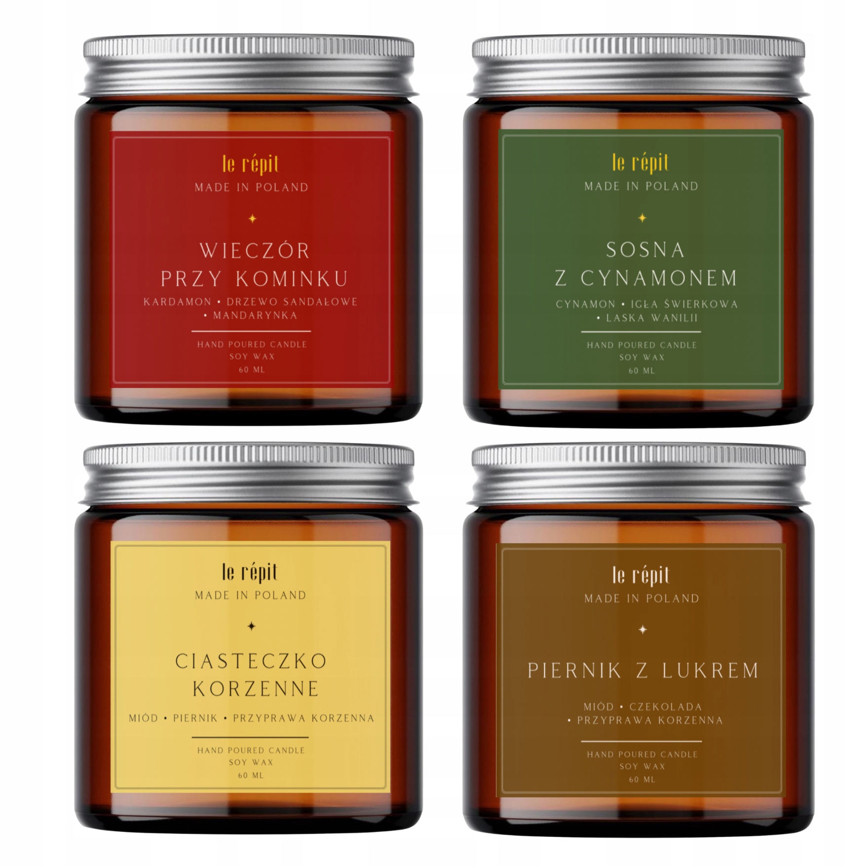 Набір соєвих ароматичних свічок: Вечір біля каміна, Сосна з корицею, Пікантне печиво, Пряники з глазур'ю 4 х 60 мл. HAND MADE