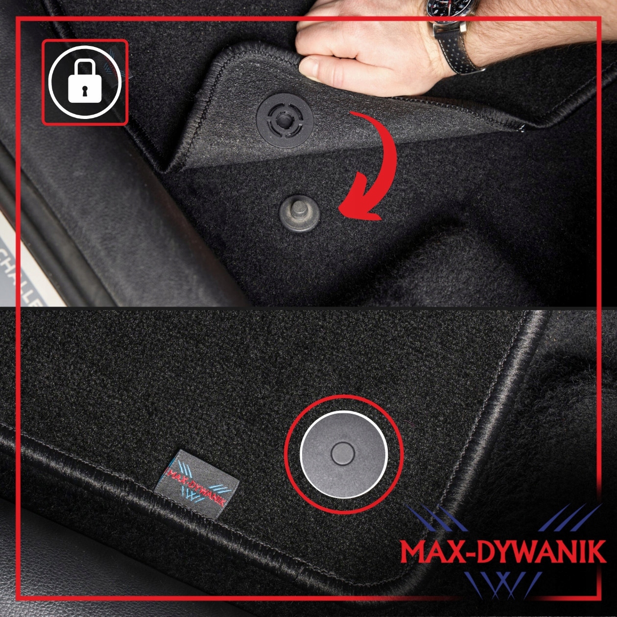 Кріплення автомобільного килимка складається з двох частин: одна частина кріпиться до килимка зверху, а інша кріпиться до килимка знизу, кріплячи килимок. Додатково в підлогу вкручується спеціальний дюбель з черв'ячною різьбою.