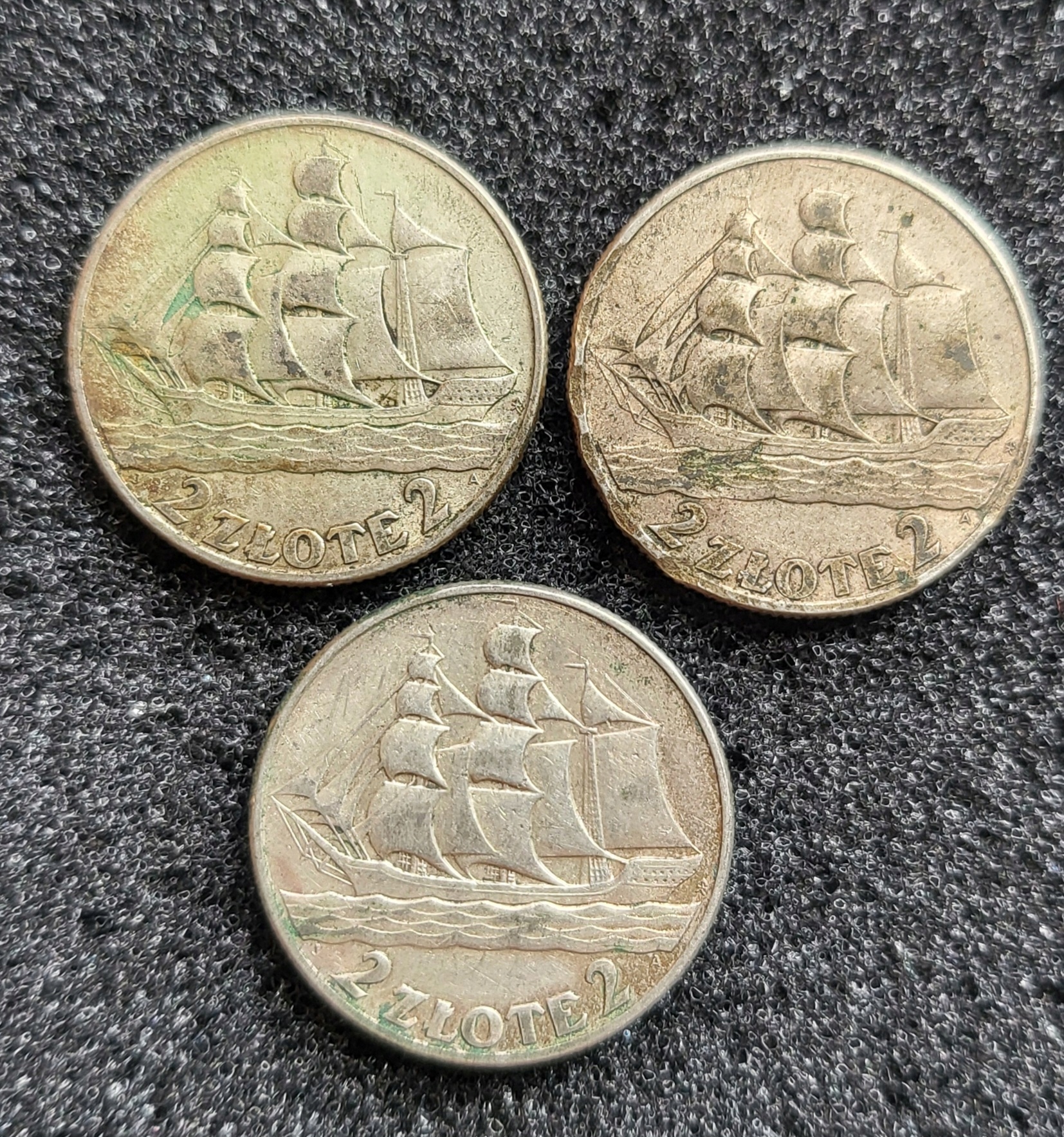 Набір трьох срібних монет PLN 2 Вітрильний корабель 1936 р.