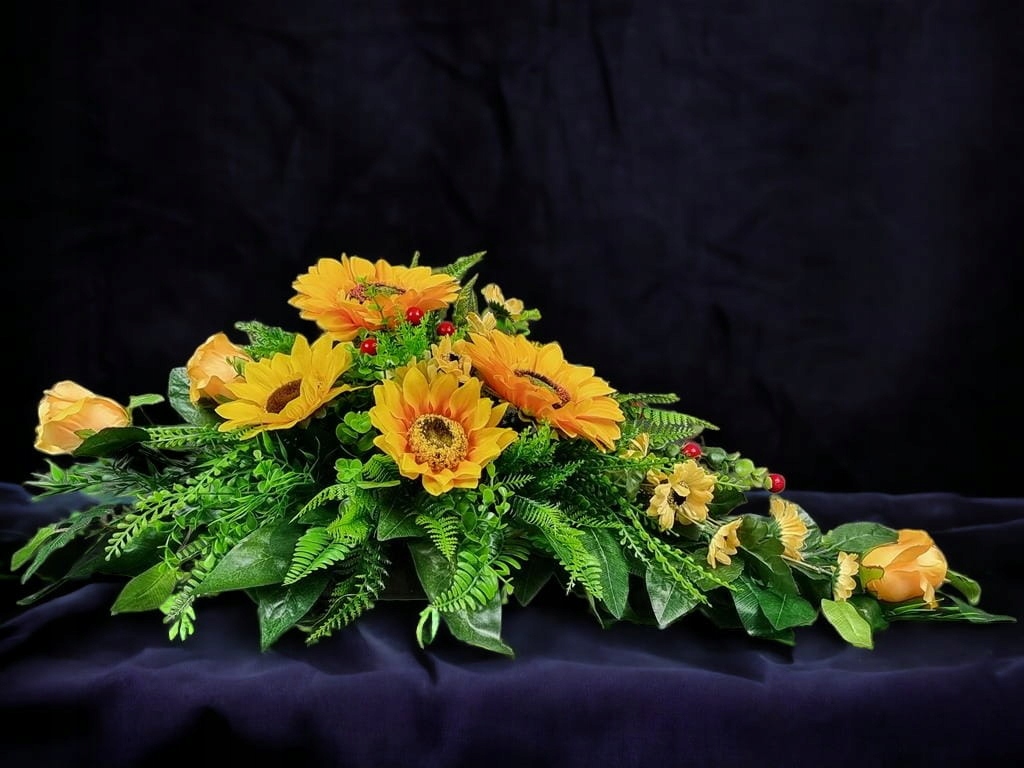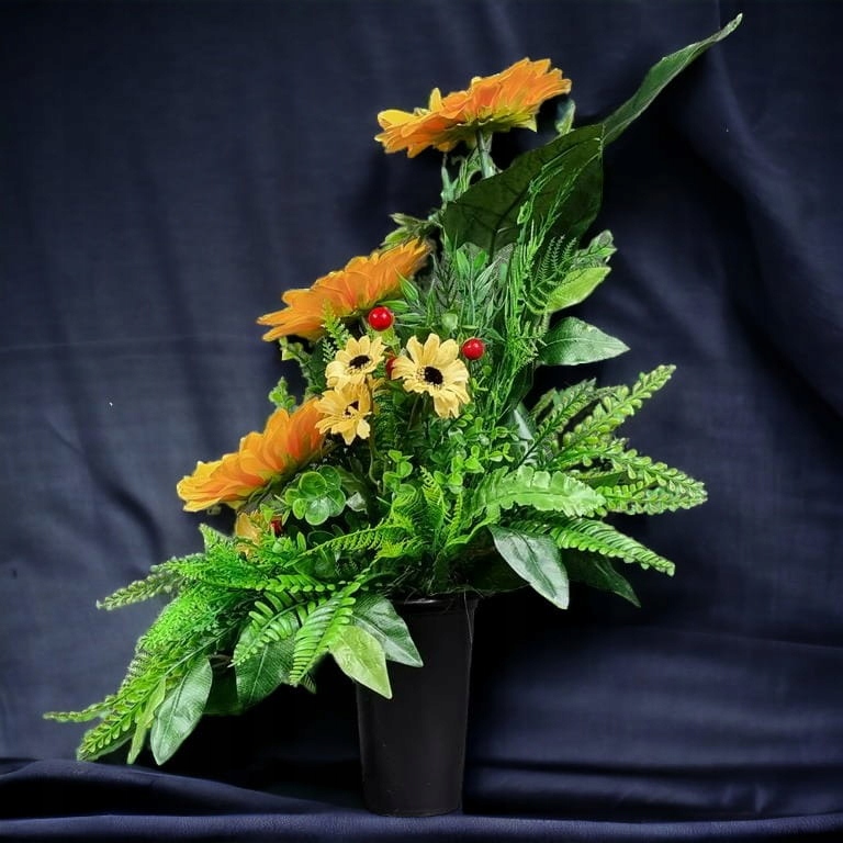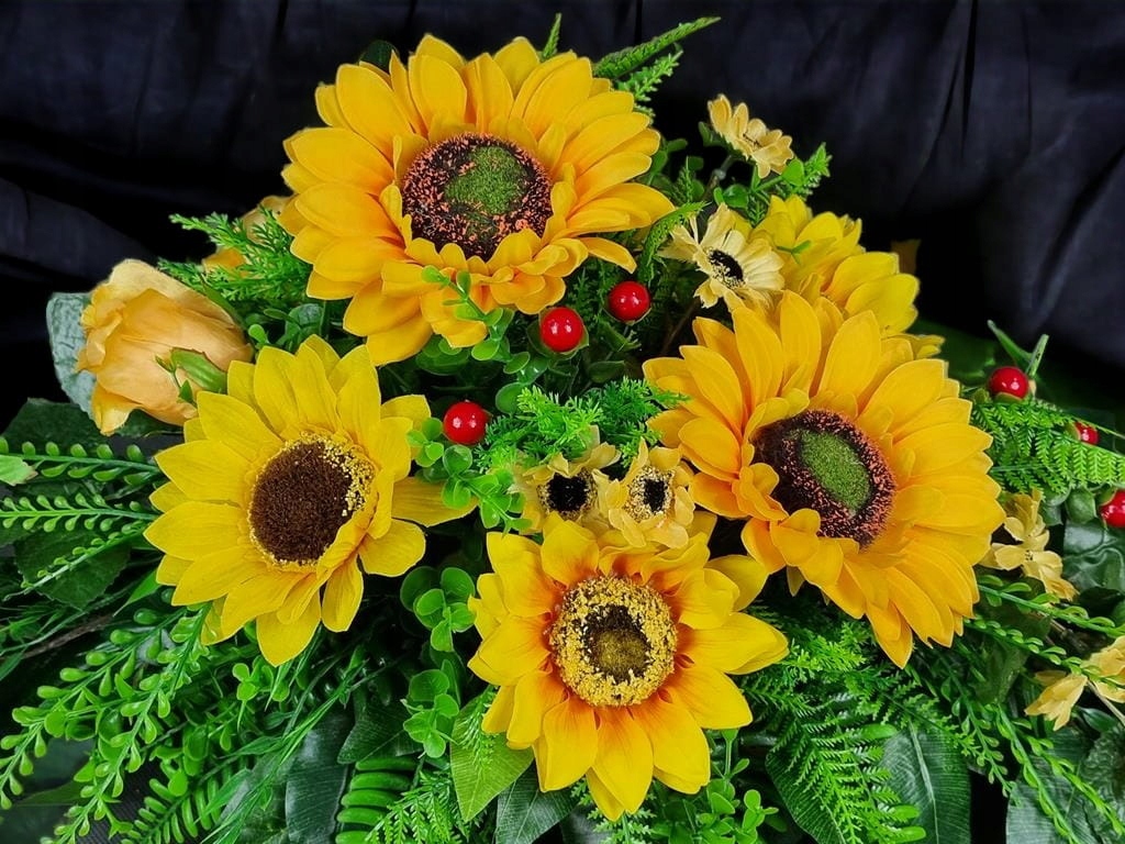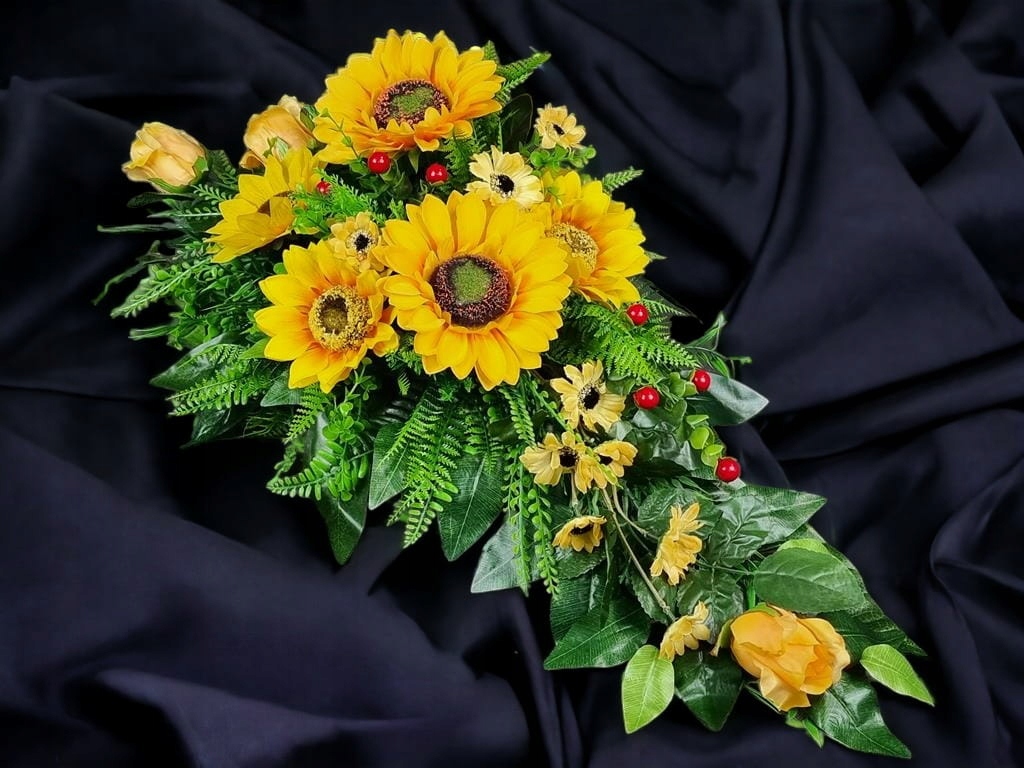 Дуже ефектний могильний комплект із соняшниками. Квіти виглядають живими. Композиція в чорній обважненій чаші.