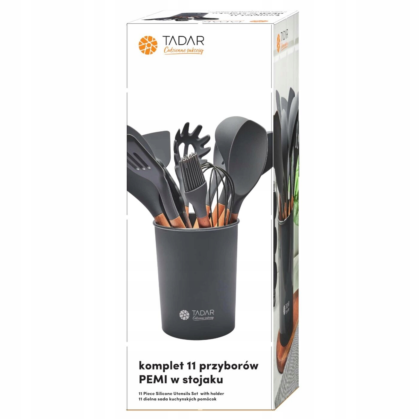 Набір з 11 кухонних аксесуарів Tadar Silico Pemi включає підставку. Набір має постійний колір, який поєднується з темно-сірим силіконом. Крім того, посуд має бамбукові ручки з отвором. Тож ви можете зберігати їх у підставці, що входить у комплект, або повісити на кухонні рейки. Ви можете стабільно розмістити все це на стільниці. Він завжди під рукою, коли ви готуєте, смажите або запікаєте. Також стане в нагоді при подачі страв і десертів. Силіконові наконечники стійкі до проникнення бруду, зміни кольору та запаху. Вони також витримують температуру від -20 до 220 градусів C. Вони не містять токсичних речовин і призначені для безпечного контакту з харчовими продуктами. Силікон також робить їх безпечними для використання в антипригарному посуді. Після цього ви зможете легко випрати всі сірі кухонні аксесуари з колекції Pemi. Вони залишаться на вашій домашній кухні роками!