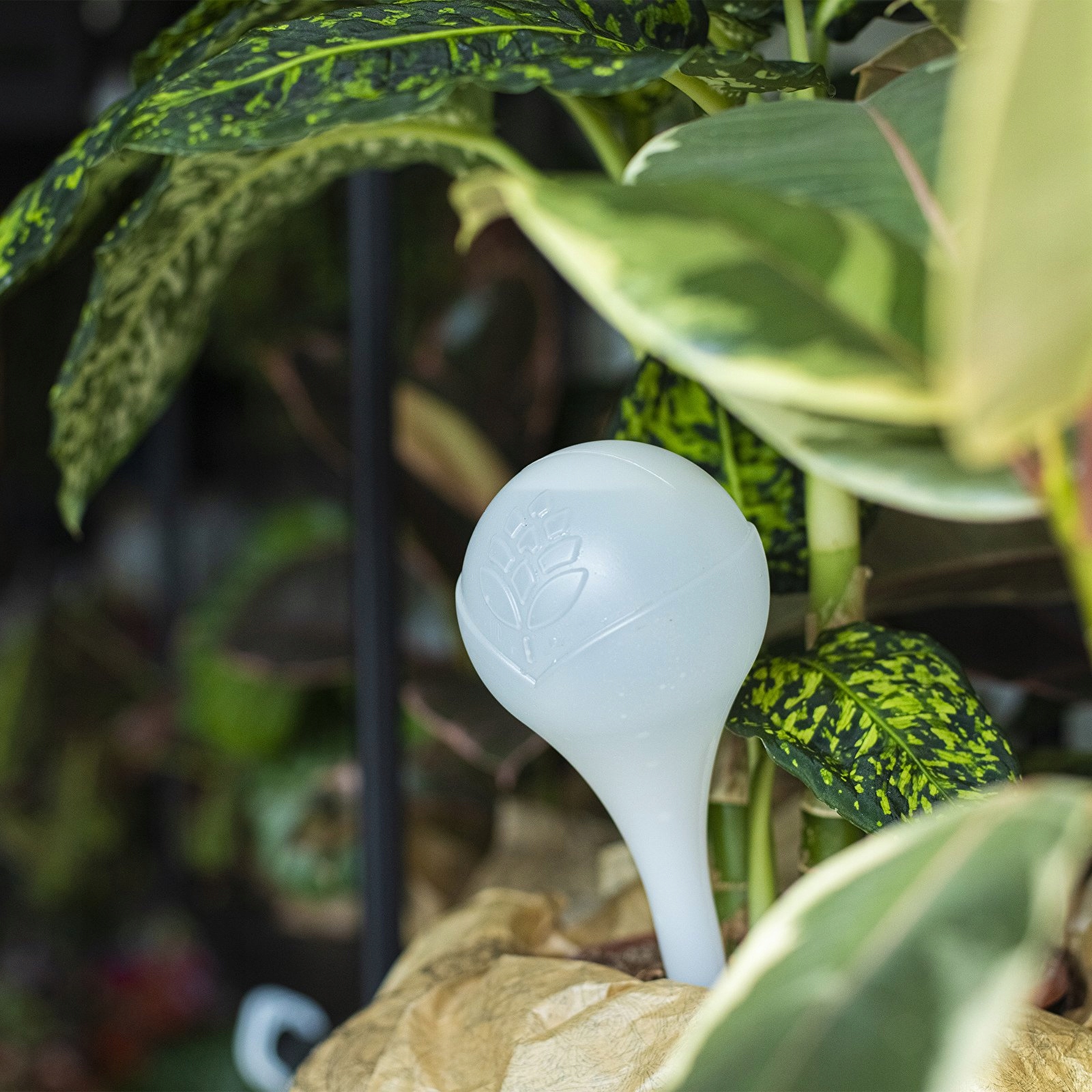 Великі поливальні кулі для рослин, прозоро-білі, ємність 400 мл. Ці незламні кулі — чудовий і практичний спосіб поливати квіти та рослини в горщиках. Вони також ідеальні, коли домочадці відсутні, і для людей, які не завжди пам’ятають регулярно поливати свої рослини.