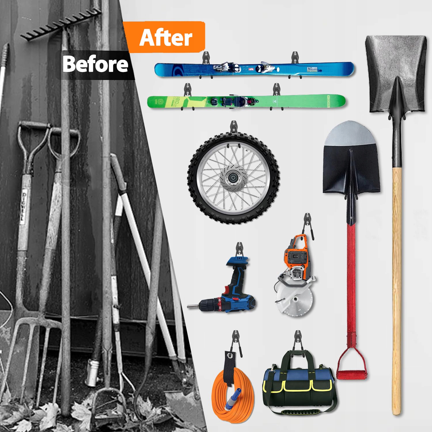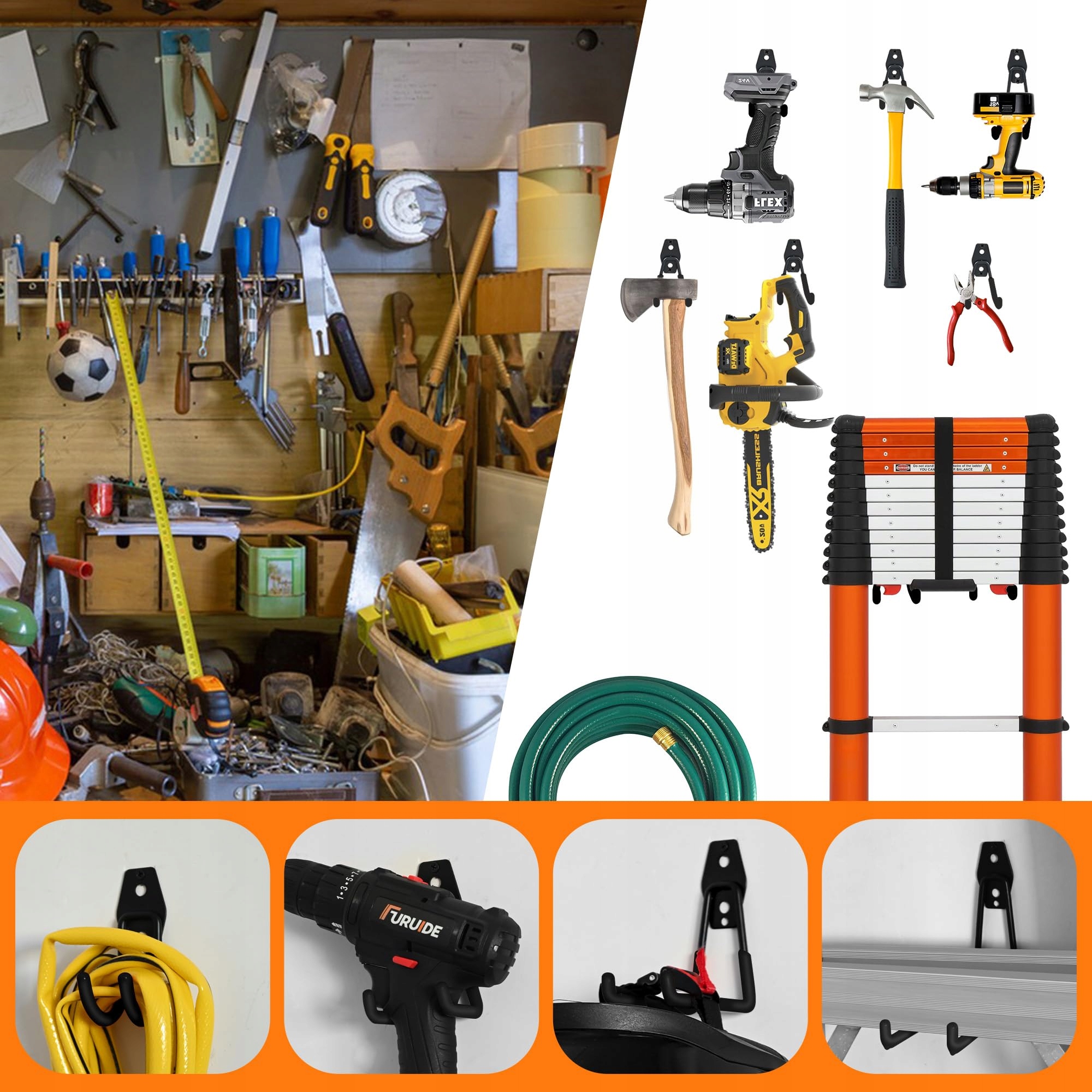 12 міцних гаражних гачків 4 різних розмірів: 2 великих U-подібних гачки, 2 середніх U-подібних гачки, 5 малих U-подібних гачків і 3 J-подібних гаражних гачки. У набір також входять 24 шурупи, 24 дюбеля для гіпсокартону та 24 білих пластикових дюбеля. Ці гачки вміщують інструменти різного розміру та ваги, допомагаючи ефективно організувати простір.