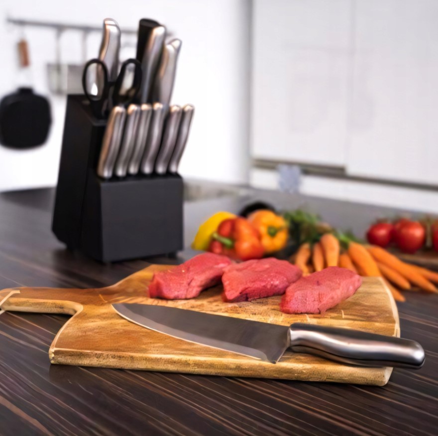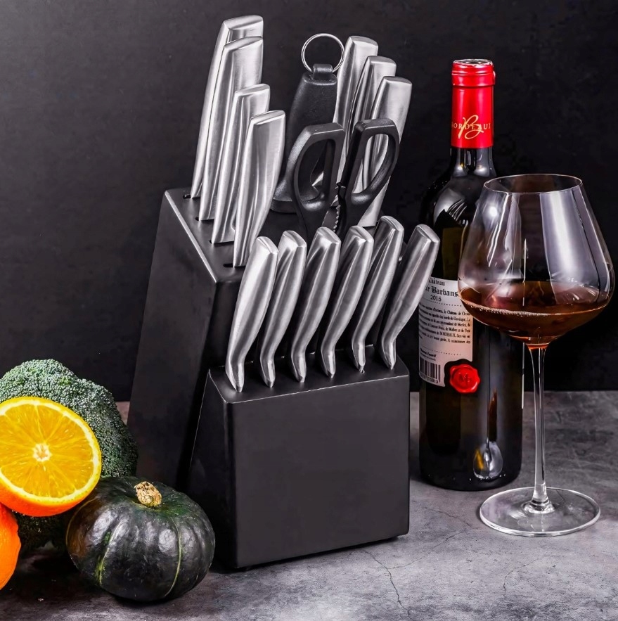 НАБІР З 16 ГОСТРИХ СТАЛЕВИХ КУХОННИХ НОЖІВ У БЛОЦІ, ПІДСТАВКА + НОЖИЦІ