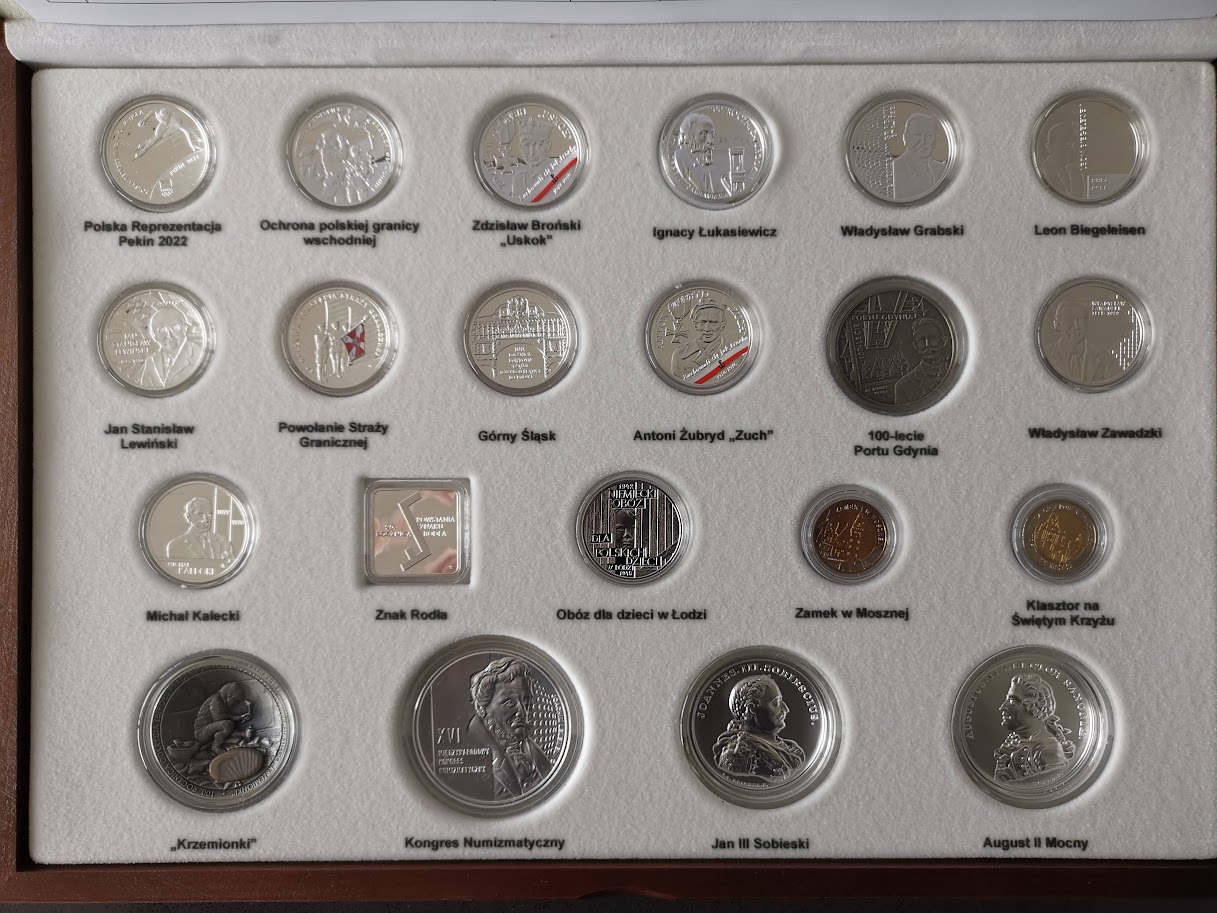 Набір із 19 срібних монет та 2 пам’ятних монет номіналом 5 злотих, випуск 2022 + папки