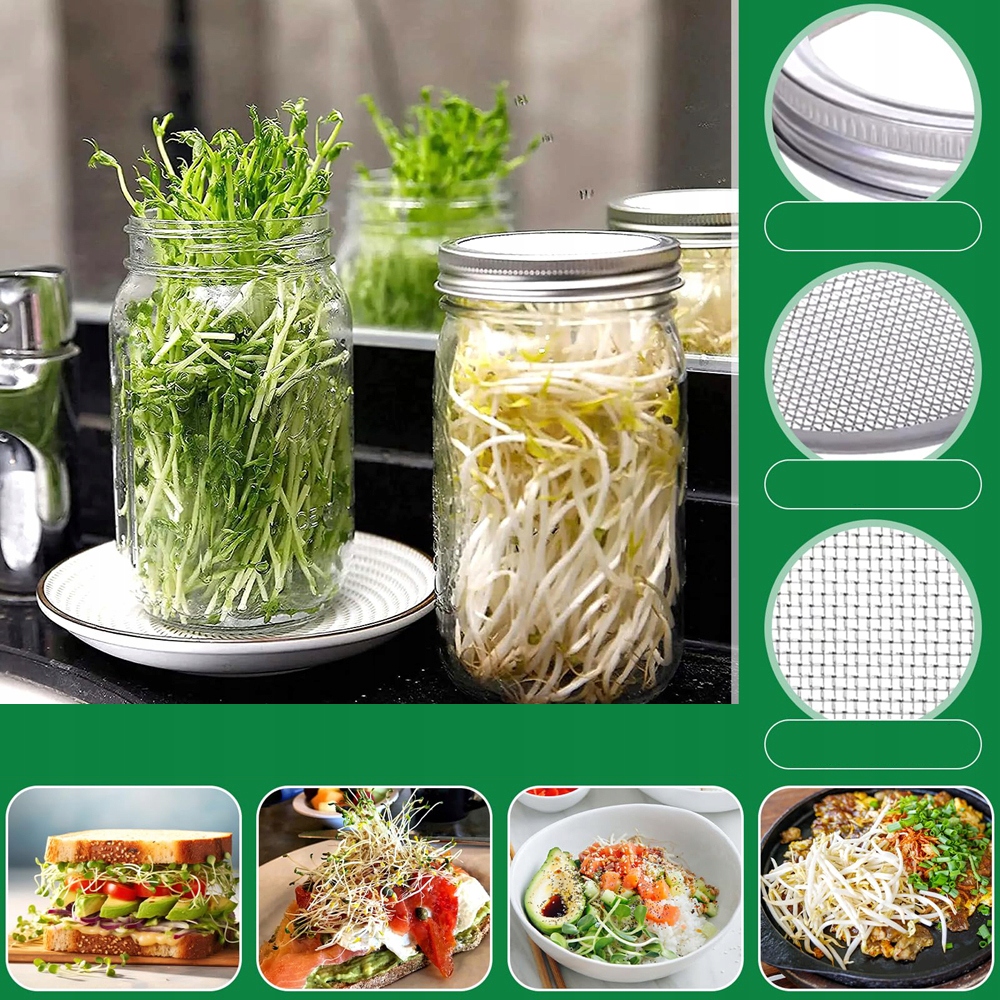 🌱 【Кришка фільтра з нержавіючої сталі 304】 Кришки для проростання виготовлені з нержавіючої сталі, не містять пластику чи алюмінію, стійкі до іржі, не хвилюйтеся про утворення шкідливих речовин, що безпечніше для людини зростання паростків. Фільтр тонкого очищення запобігає випаданню насіння і проникненню в банки мошок. Опукла форма фільтра краще прилягає до кришки та полегшує його затягування.
