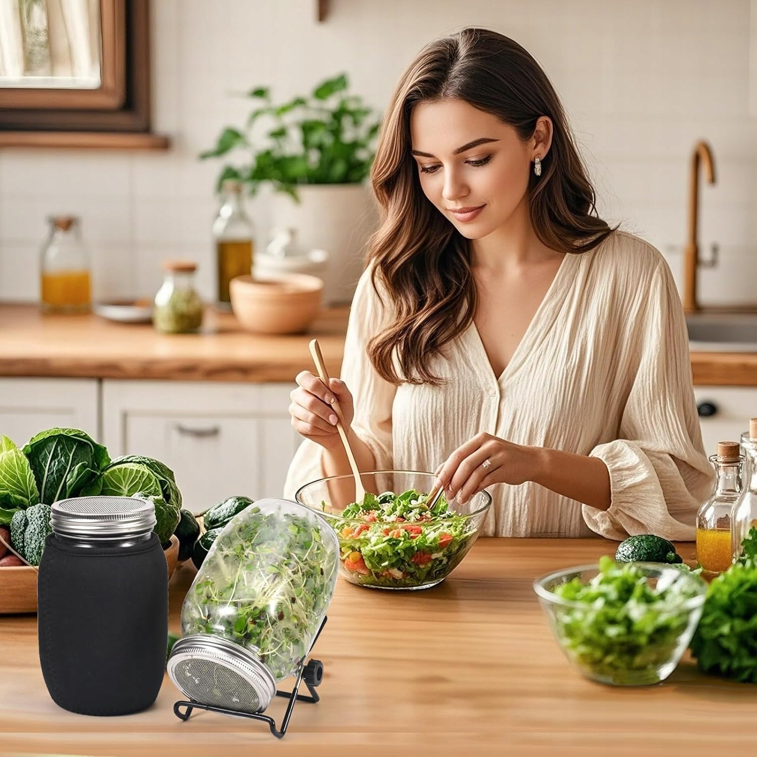 🌱 【Повний набір банок для паростків】 За допомогою цього набору банок для паростків ви можете вирощувати власні смачні паростки та мікрозелень вдома. У набір входять 2 банки з широким горлом по 1000 мл, 2 кришки з нержавіючої сталі, 2 решітки, 1 піддон для крапель, 2 кришки для тені, 1 щітка Дозволяє пророщувати квасолю мунг, брокколі, люцерну, горох, сочевицю тощо. Вирощуйте власне насіння та насолоджуйтеся найсвіжішими органічними паростками в будь-якому місці. час.