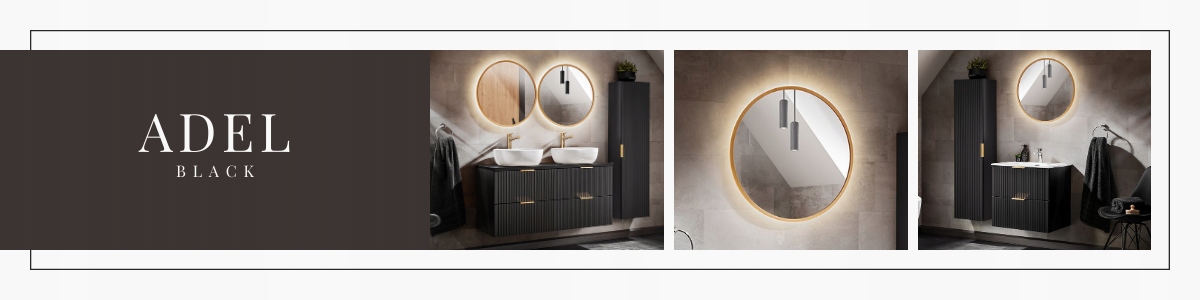 Колекція ADEL складається з класичних твердих пропорцій у поєднанні з унікальними вертикально фрезерованими фасадами. Завдяки такому поєднанню меблі цієї колекції є універсальними та ідеально підходять як для сучасних, так і для класичних облаштувань, а їх висока функціональність забезпечить комфорт навіть найвимогливішим користувачам. Перевагою цієї колекції є можливість вибору ручок: глянцеве золото, глянцевий хром і матовий чорний. Завдяки цьому ми можемо підібрати колір ручок до фурнітури або дзеркала в різних рамах.
