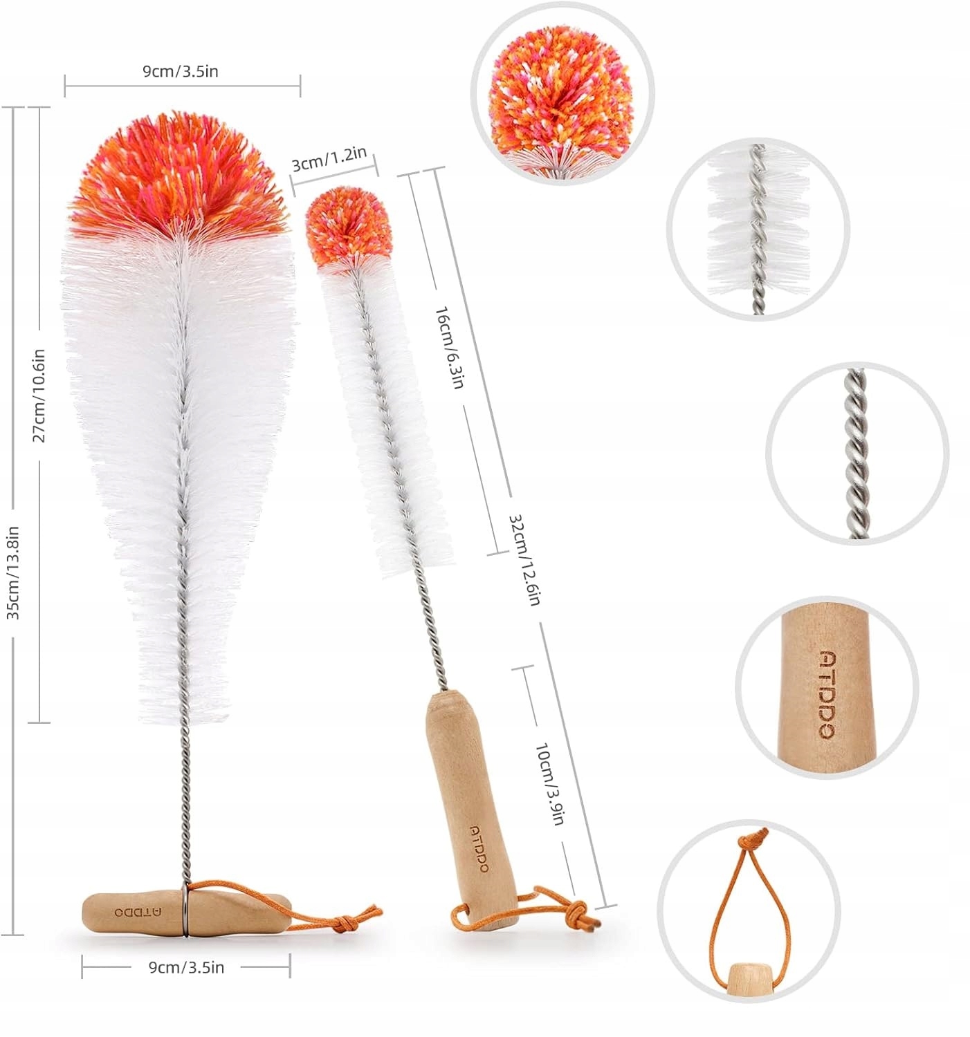 ✅Набір із двох кистей різного розміру: У набір входять дві кисті різного розміру: одна 35 х 9 см, а інша 34 х 3,5 см, що дозволяє легко пристосуватись до різних типів посуду. Ідеально підходить для чищення скляних та алюмінієвих пляшок, шейкерів, графинів, дитячих пляшечок і контейнерів з вузьким горлом.
