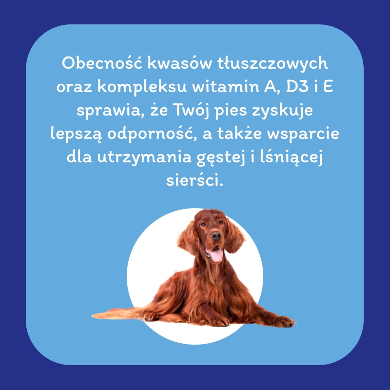 Крім того, наявність омега-3 і омега-6 жирних кислот допомагає підтримувати здорову шкіру та блискучу шерсть.