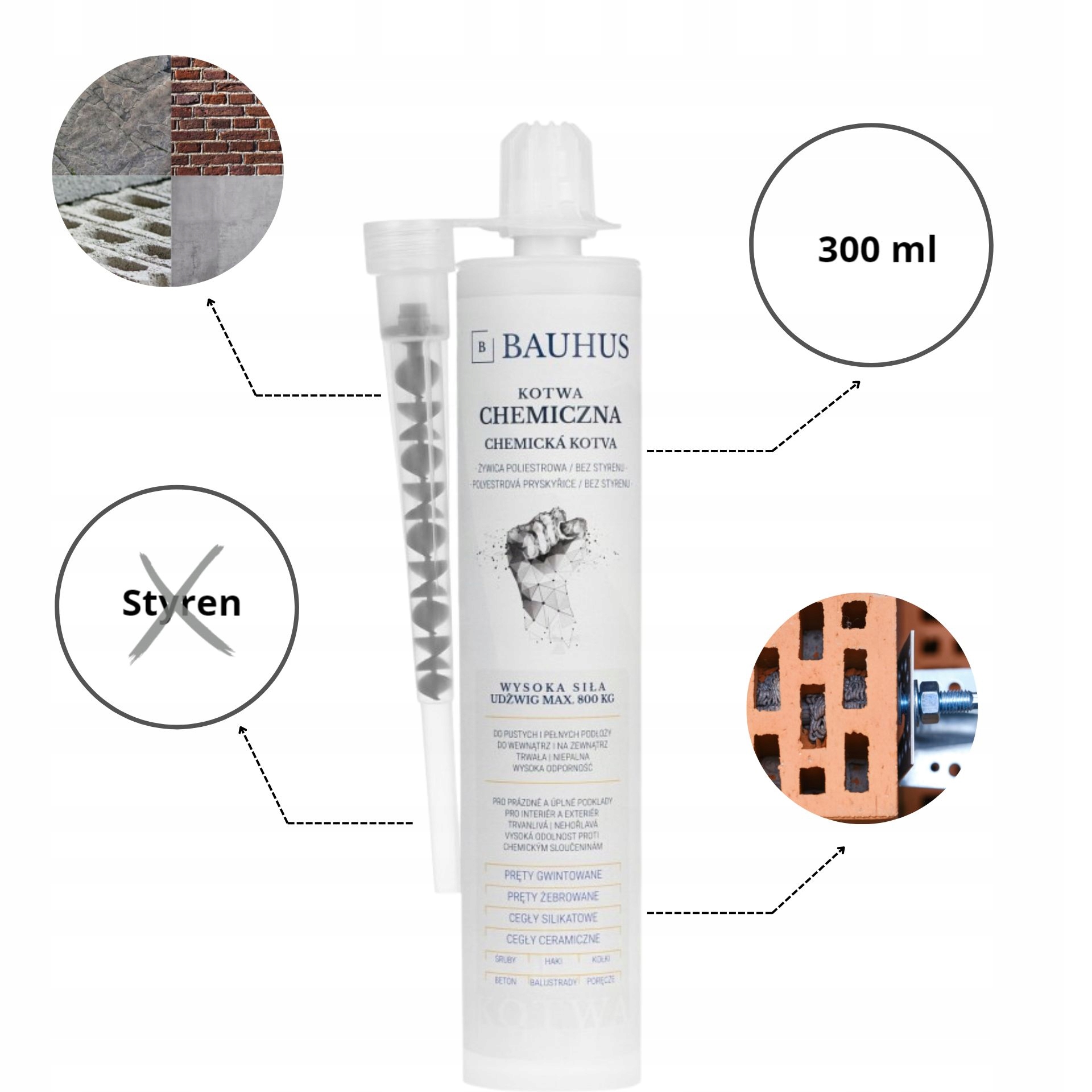 Хімічний анкер бренду Bauhus складається з поліефірної смоли без вмісту стиролу. Ця двокомпонентна система хімічного кріплення, яка швидко затвердіє, забезпечує міцний, хімічно стійкий анкер після затвердіння.
