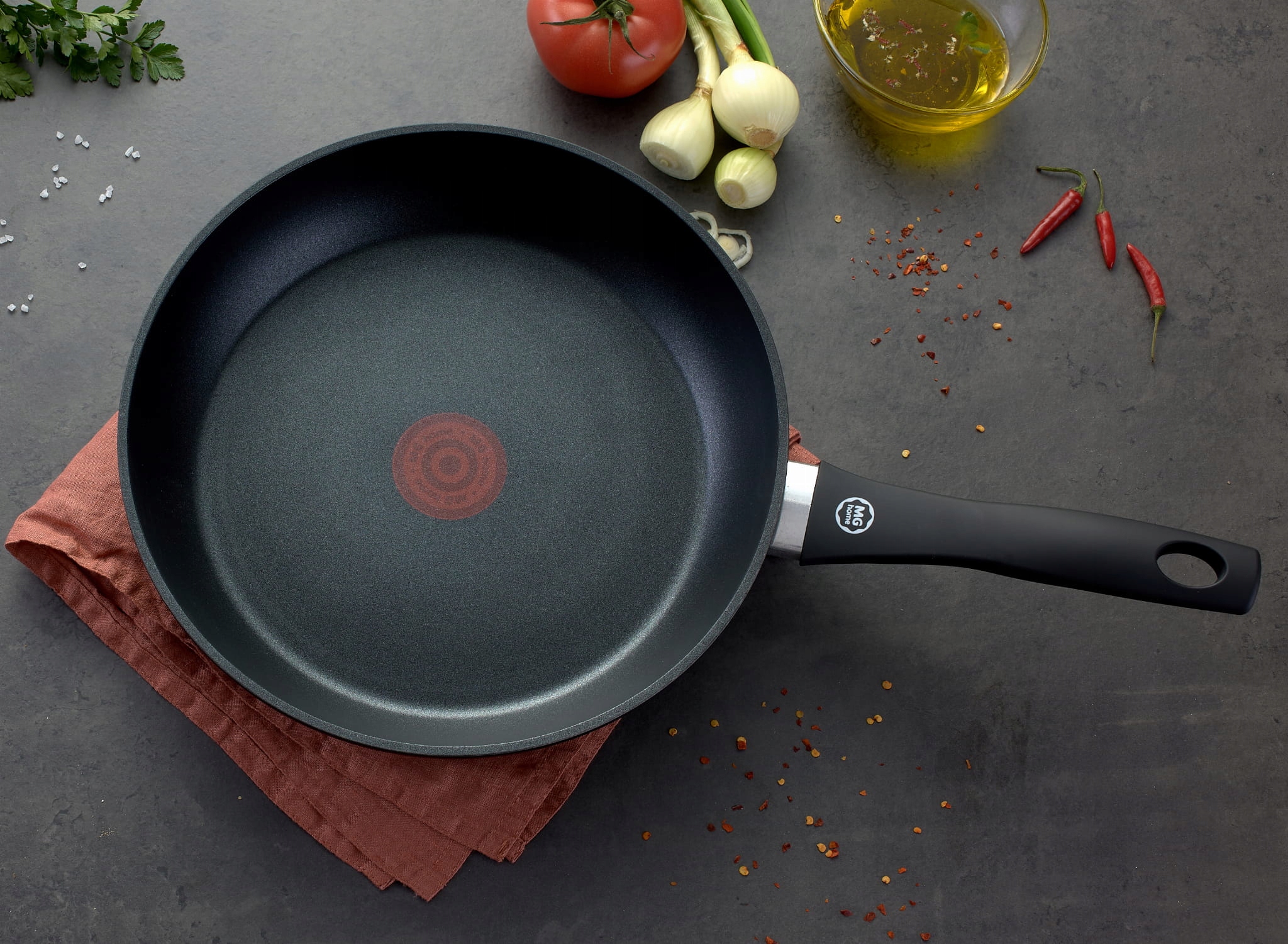 - Оснащений термосенсором, який стає червоним, коли сковорода досягає ідеальної температури для смаження,
