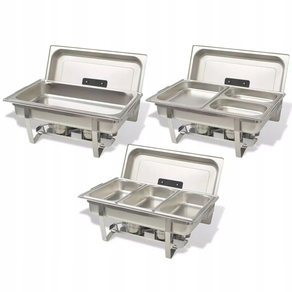 Набір з трьох мармітів ідеально підходить для кейтерінгу та домашніх свят Міцна конструкція з нержавіючої сталі, стійка до корозії, проста в очищенні та довговічна у використанні Гастроємності забезпечують універсальне використання та можливість багатьох комбінацій Заокруглені кути та гладкі поверхні полегшують миття та підтримку гігієни Кришки з ізольованими ручками, підставки з тримачем кришки та ємності для нагрівання пасти