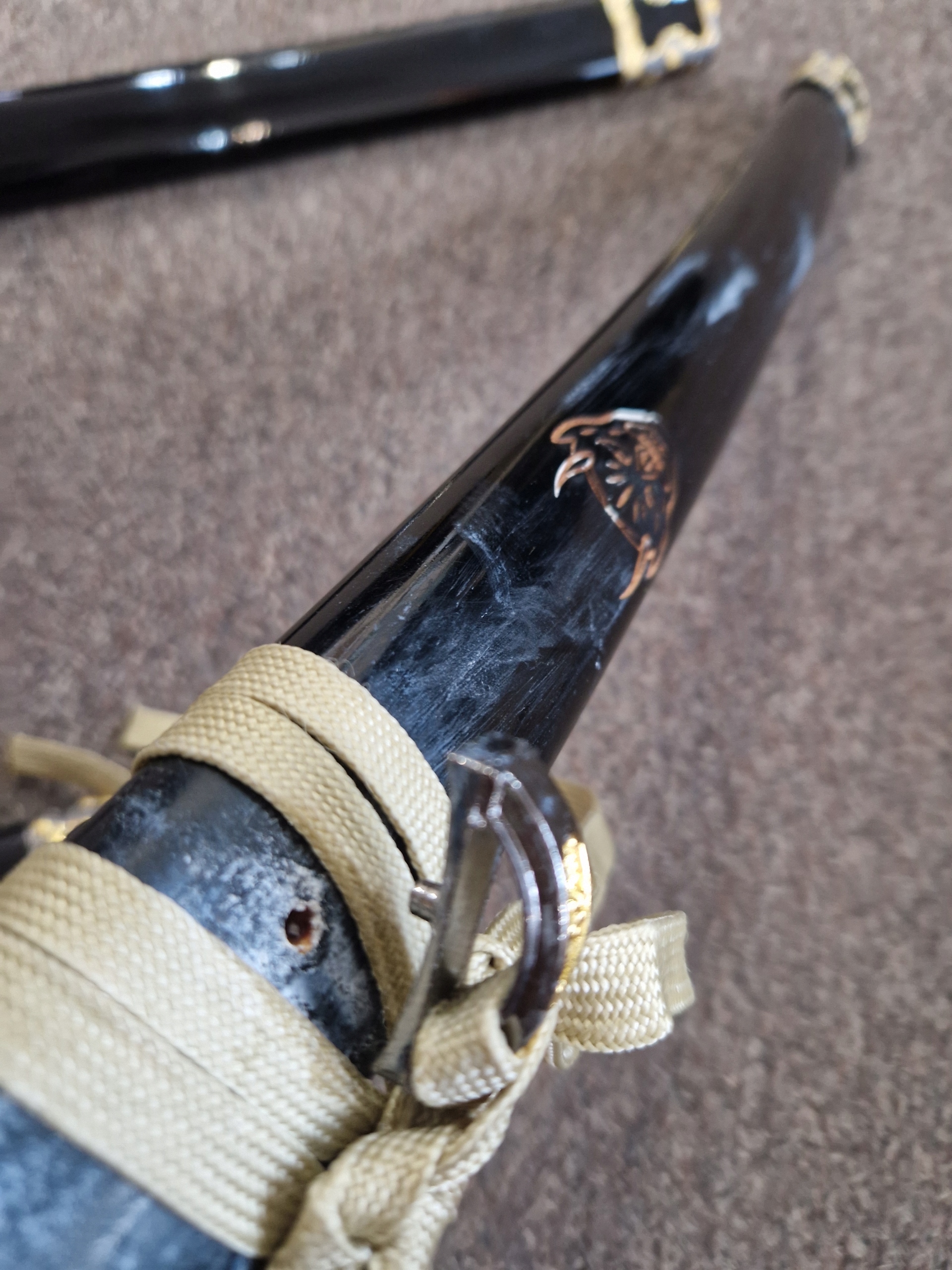 - НОЖНИ/ САЯ: Тверда деревина, розписана вручну чорним кольором, ручне різьблення, чорна бавовняна ручка, імітація шкіри променів, металева цуба.