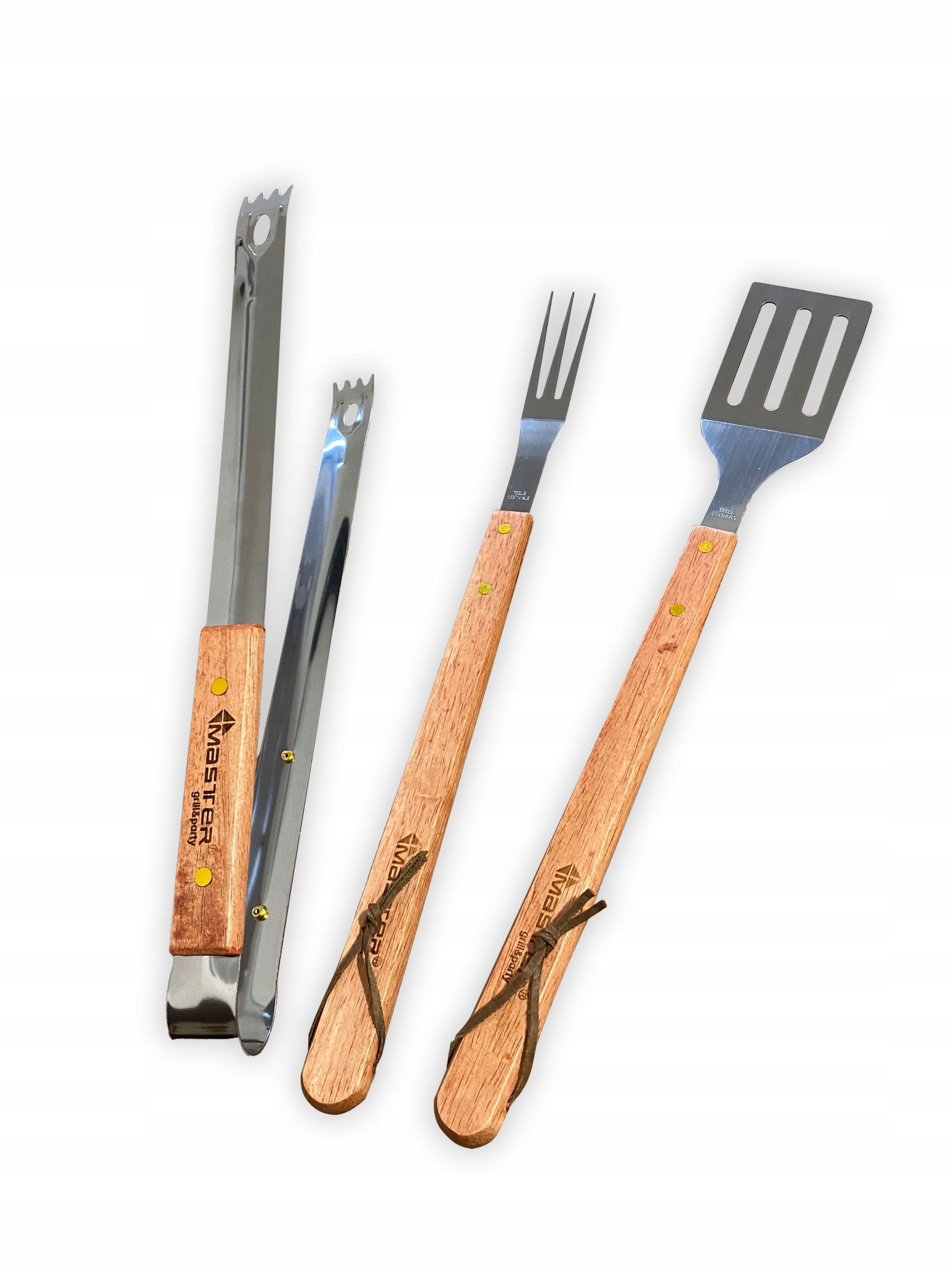 Набір аксесуарів для гриля, 3 шт (щипці, лопатка, вилка), матеріал - хромована сталь, дерев'яні ручки, підвіски на ремінці. Збільшена довжина ручок полегшує роботу над каміном. Дерев'яні ручки добре лежать в руці і не ковзають. Набір виглядає надзвичайно елегантно. З його допомогою приготування на грилі стане ще приємнішим.