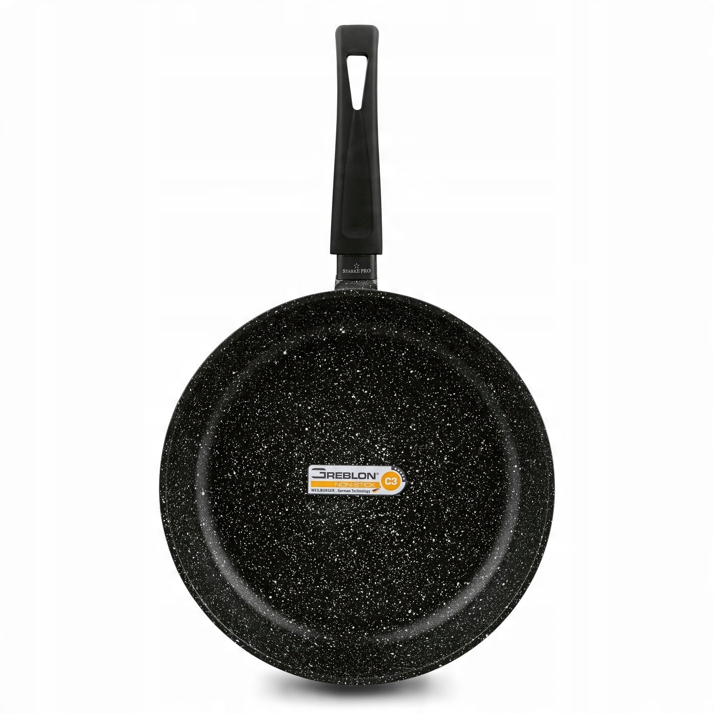 Інша інформація: - сковорідки алюмінієві, литі, - покриті покриттям Greblon C3, - тришарове покриття, - 8000 циклів стирання, - товщина покриття: 40-45 мкм, - товщина краю : 5,5 мм, - товщина стінок: 1,6 мм, - товщина дна: 3,8 мм, - без PFOA, - м'які на дотик пластикові ручки, прикручені, - повстяні накладки, - призначені для ручного прання