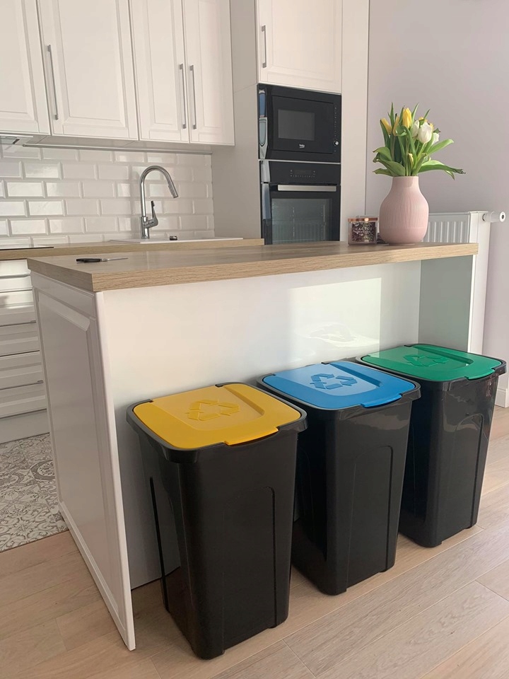 Кожен контейнер виготовлений з високоякісного пластику. Вони ідеально підходять для будь-якого дому та офісу, де щоденне розділення сміття є важливим. Відповідні кольори, наближені до загальноприйнятого маркування, дозволять легко підібрати тип відходів, що викидаються до окремих контейнерів. Відкидна кришка запобігає виходу неприємних запахів з кошика. Ідеально підходить для сортування бруду на пластик, папір і скло.