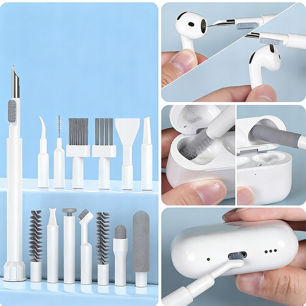 Металевий наконечник ручки для чищення навушників видаляє стійкий бруд, міні-щіточка очищає сіточки навушників, а кругла губчаста й м’яка щіточка досягають внутрішньої частини зарядного футляра. Довга ручка дозволяє легко підключати аксесуари і зручно використовувати.