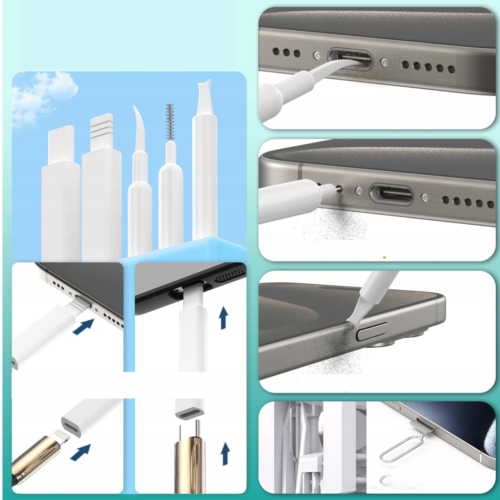 У наборі є інструменти різної форми та кута, які дозволяють ретельно очистити порти зарядки та динаміки. Силіконові щітки для роз'ємів Lightning і USB-C забезпечують безпечне очищення, а виймання SIM-карт стає швидким і зручним. Доданий сенсорний стилус працює плавно, не залишає відбитків пальців і ідеально підходить для сенсорних екранів.
