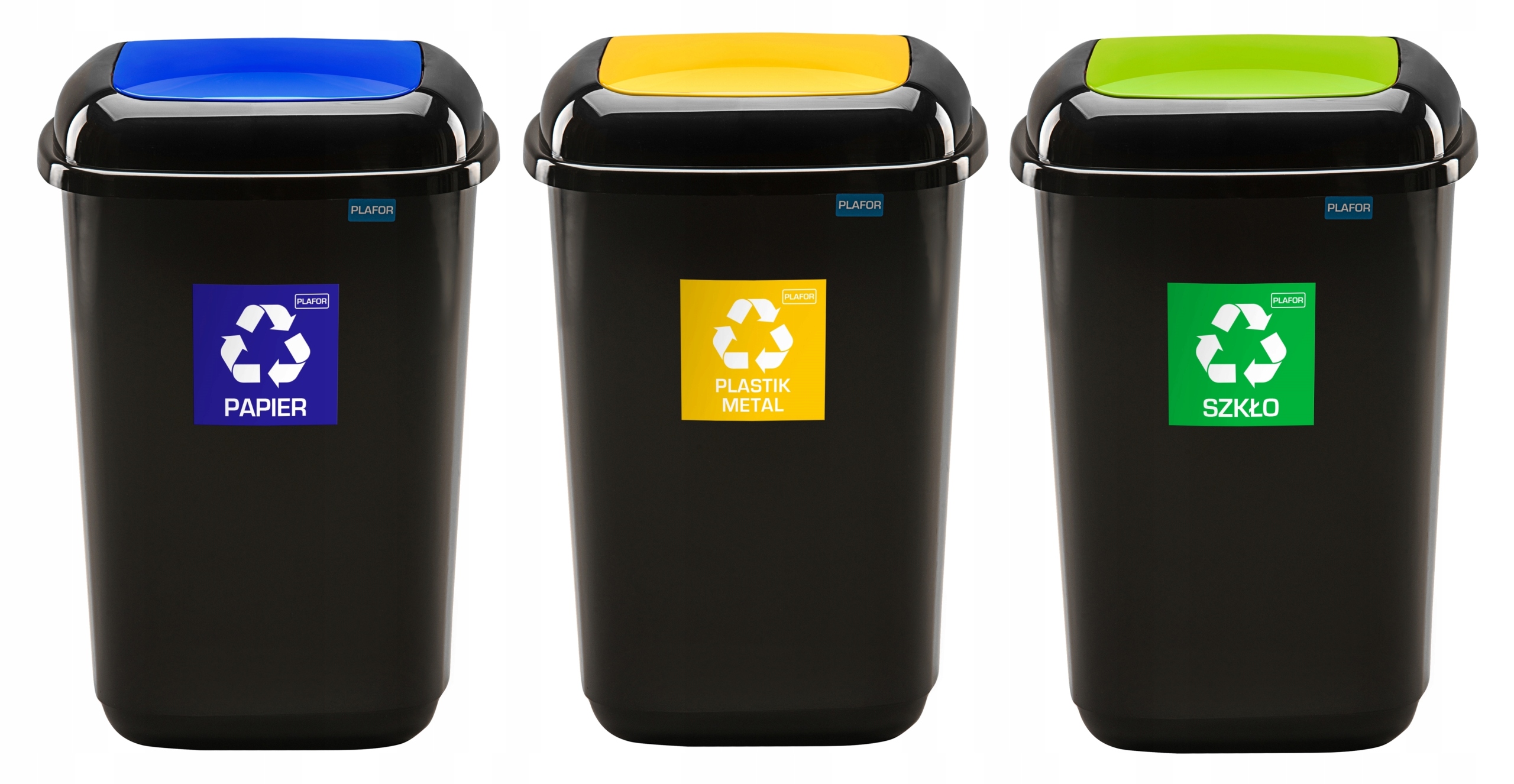 - Колір: Синій - ПАПІР, Зелений - СКЛО, Жовтий - ПЛАСТИК;