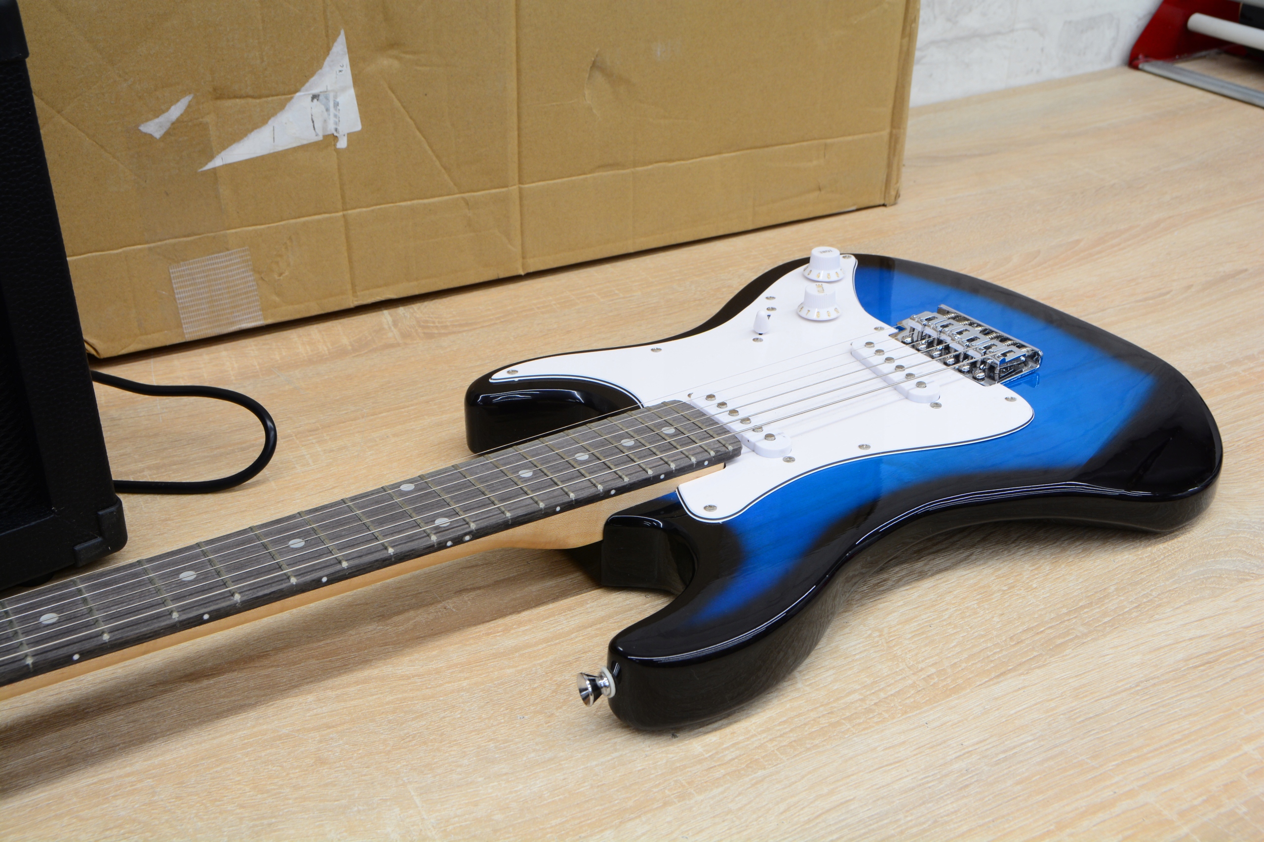 - ГІТАРНИЙ НАБІР - разом із гітарою ви отримуєте транспортний кейс, медиатори, ремінь, важіль для удару, запасні струни, підставку, 10-ватний тренувальний підсилювач із кабелем і капо