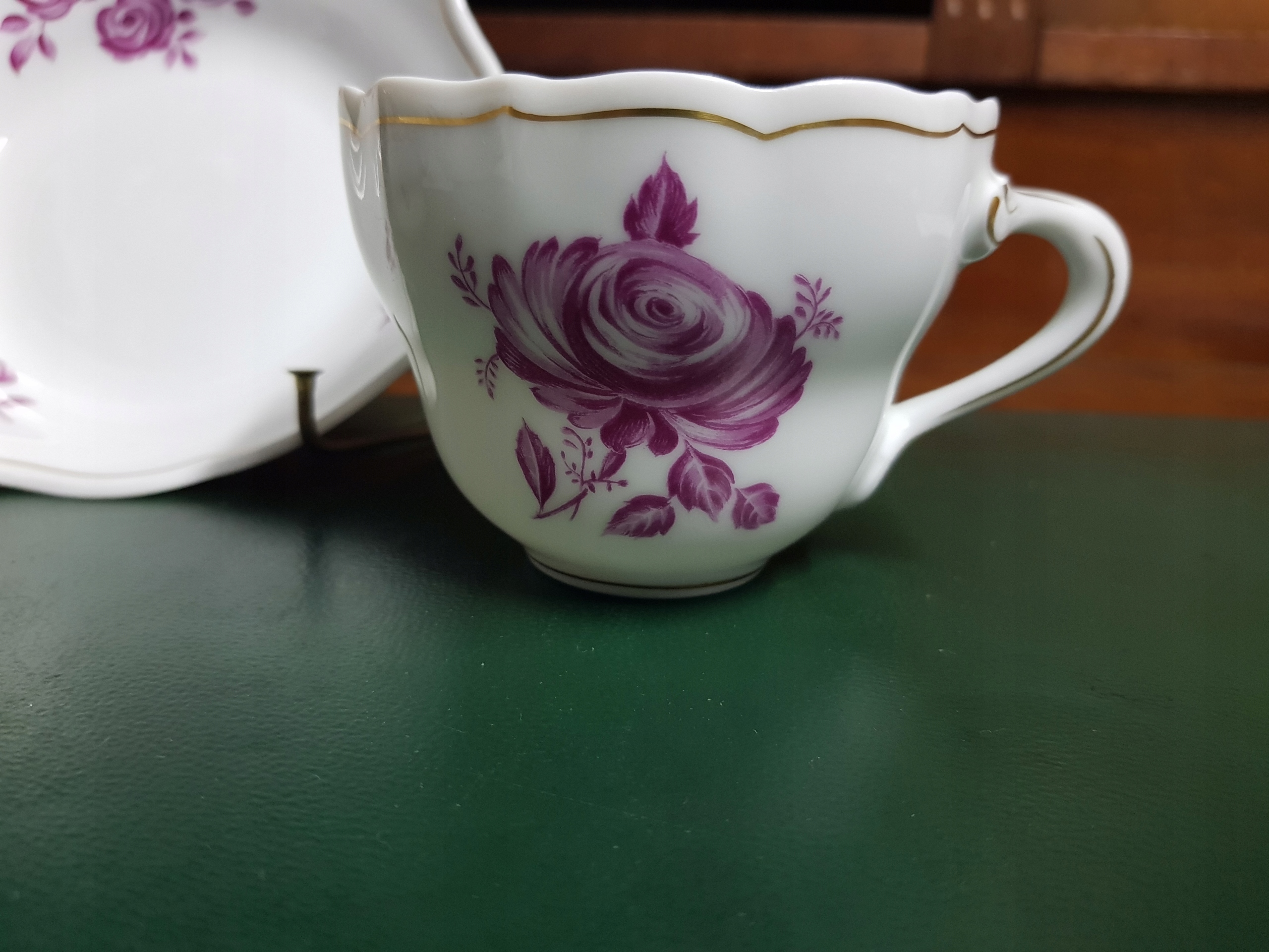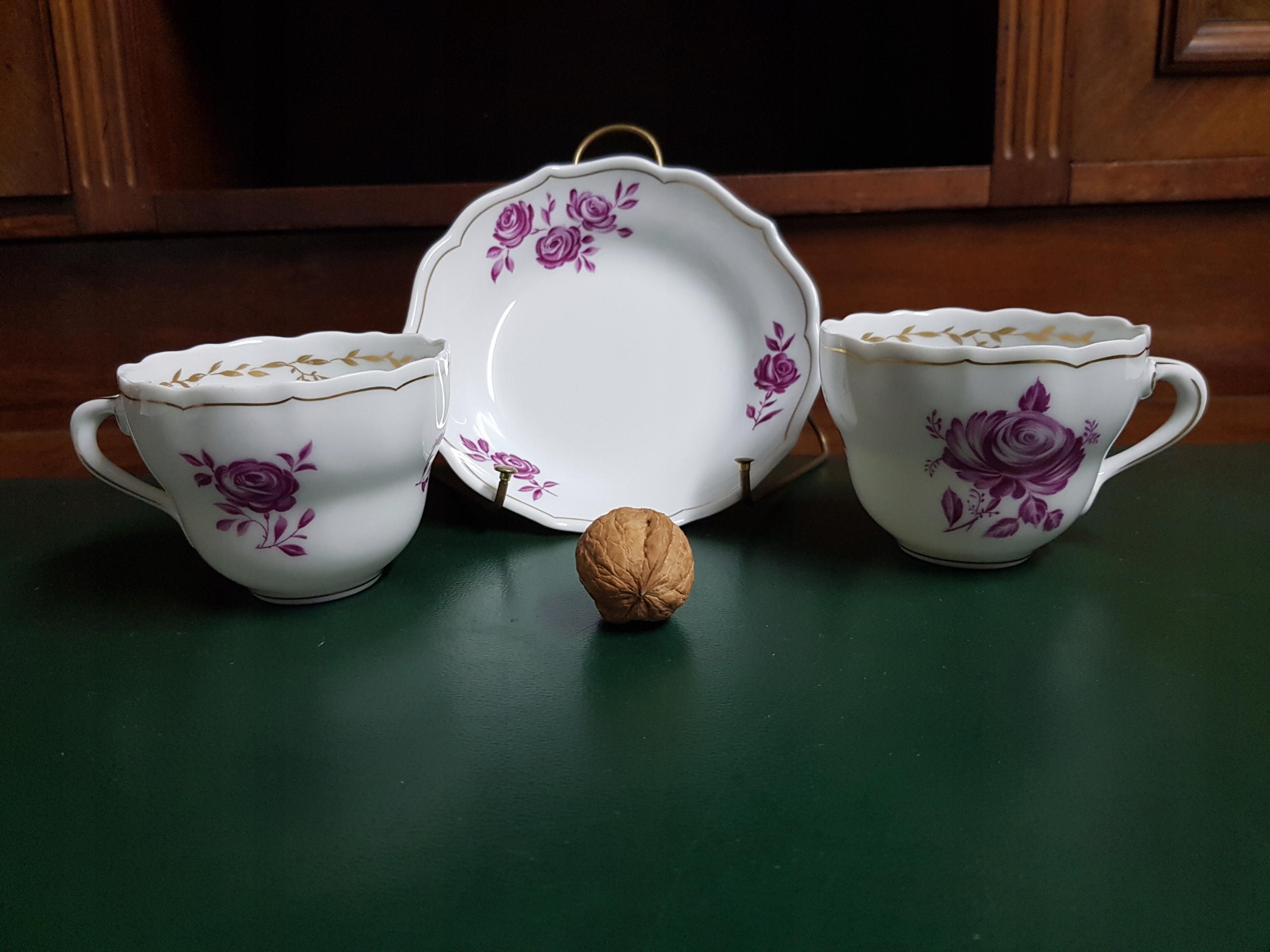 Предметом аукціону є набір з 1 блюдця та 2 чашок Hutschenreuther, модель Марія Терезія. Рожева троянда. Золота лінія та гірлянда.